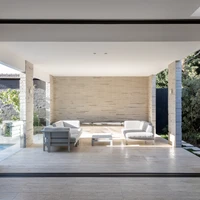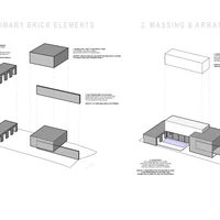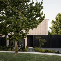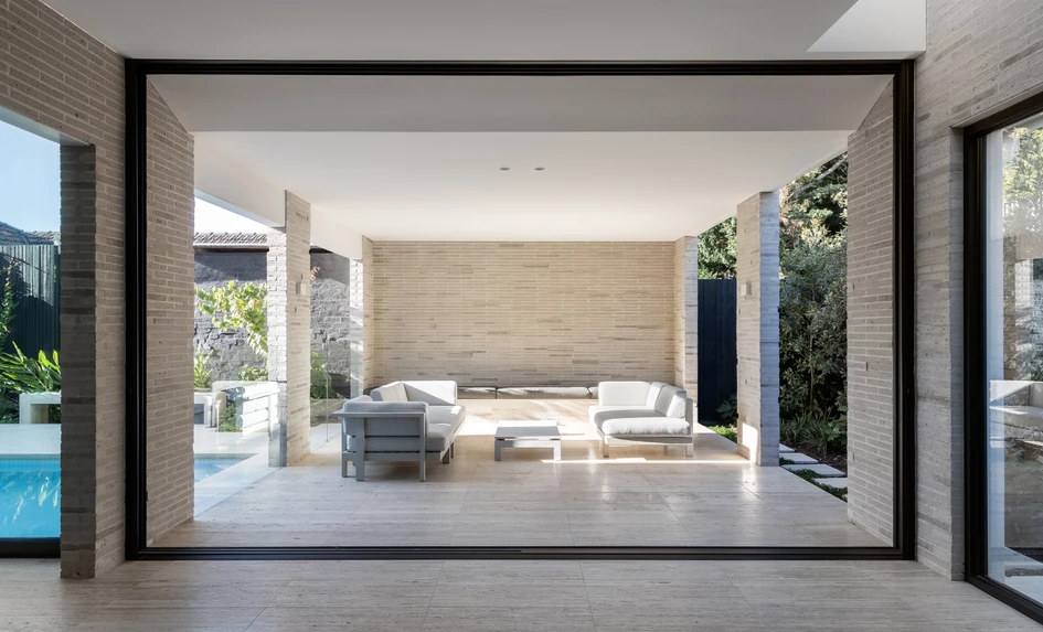 Following extensive research and experimentation, a concrete slimline brick was chosen to give individual identity to the three key built forms that generate the arrangement of the house. At the rear of the house, a continuous brick colonnaded form stretching from inside to outside provides a seamless transition from indoor to outdoor entertaining spaces, with large glass sliding doors that can be fully retracted to further blur the boundaries.