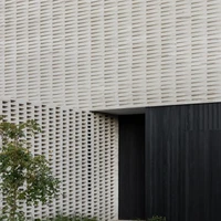 On this colonnade form, the occasional brick has been indented or laid backward to expose the darker rear side of the brick, adding texture and depth to the monolithic material; a blade wall that stretches out towards the street is characterized by hit-and-miss brick patterning, providing dappled light and privacy to the front garden beyond; while the monolithic first-floor facade – giving the house its street identity - is defined by angled bricks every second brick course, counteracting the massive expanse with delicate and textured detail.