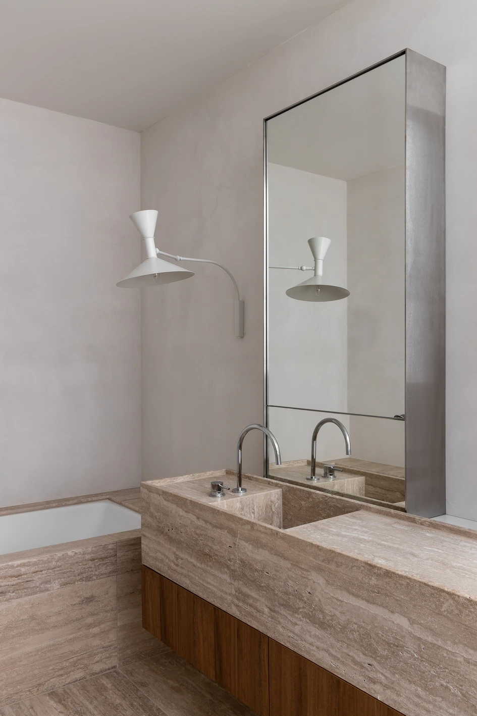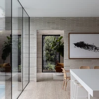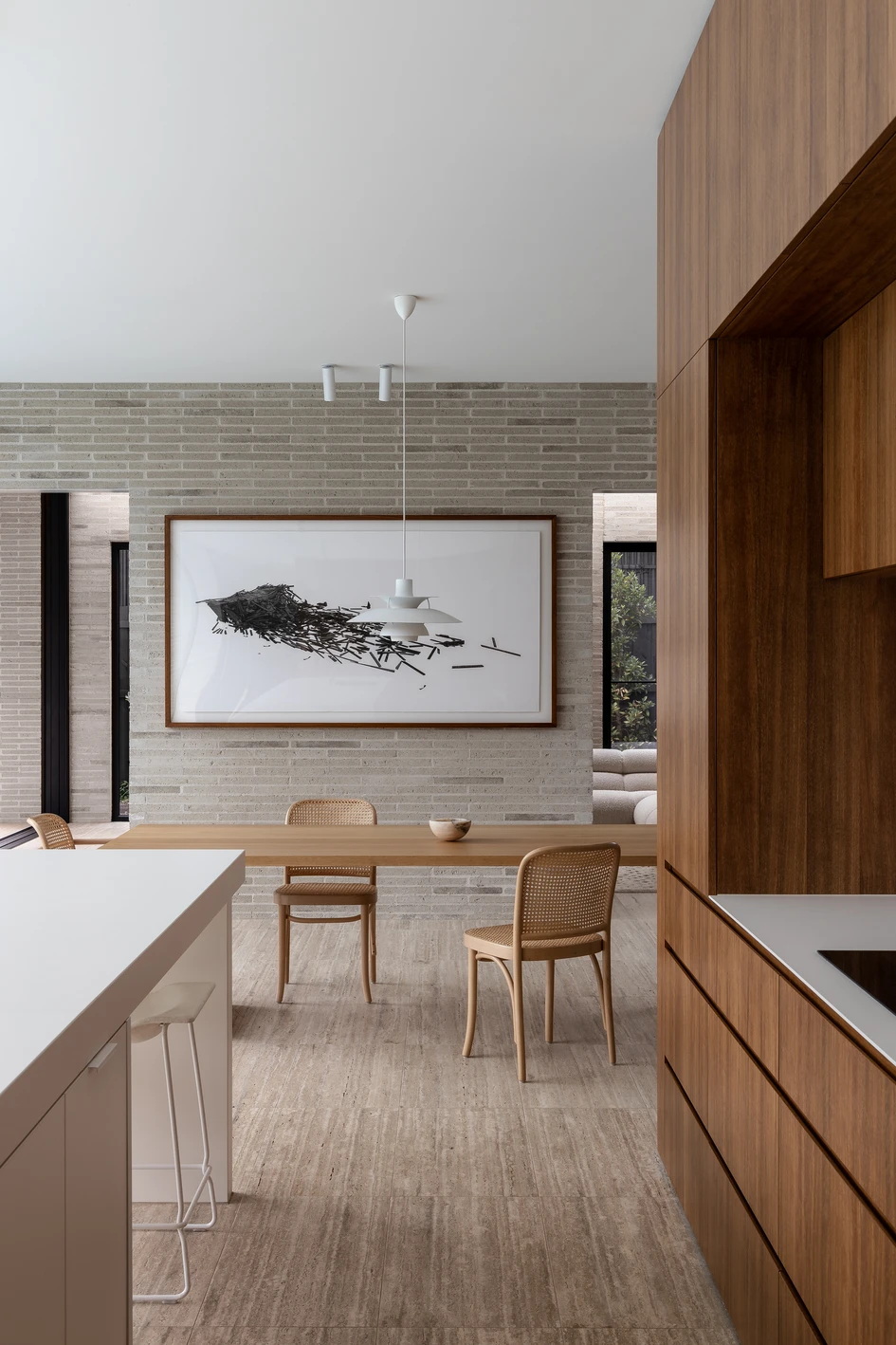 The garden design by Amanda Oliver Gardens was vital to the success of the project. The lush greenery perfectly complements the minimal building palette and softens the hard building surfaces of the travertine and brick. The constant connection to the garden and pool has really informed how the clients have experienced their new home. Particularly during lockdowns – Melbourne endured the world’s longest period in lockdown during the pandemic - the ability to share meals outdoors with ease, enjoy the pool on sunny days, or find some solitude and sanctuary from home-school within the courtyard garden have been unexpected boons for the family.
