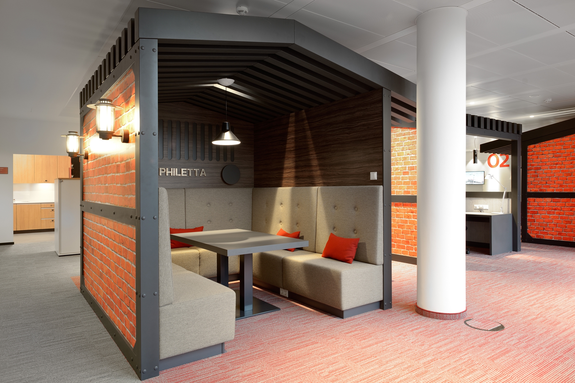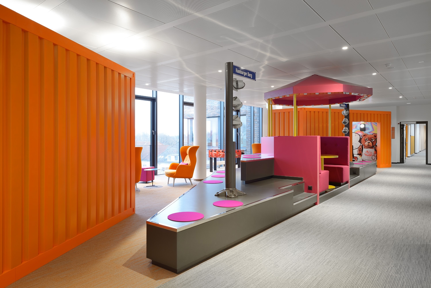 Through the entire building SBP- Seel Bobsin Partner generated an integral guideline in appearance of standard color-and themes codification. This conceptual stringend elements of color and subject are visible in every room. On the one hand it makes orientation easier for the employees and on the other it increases the identification with the employees sourroundings. The several floorthemes are climaxed in the centralized "Break-out-Areas". Part of the design process was the participation of the Philips employees; finding the topics for these areas, respective floor levels. The topics are typical Hamburg motives, which have been transfered and realized with humoristic parts and quotes . The designtheme reaches furthermore all the office working areas, because of the colours and motive selection, which has been continued with signs and graphics.