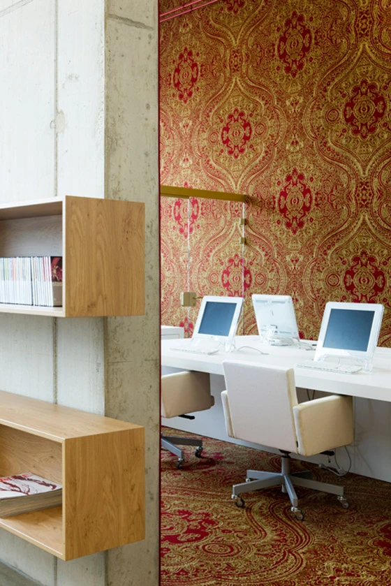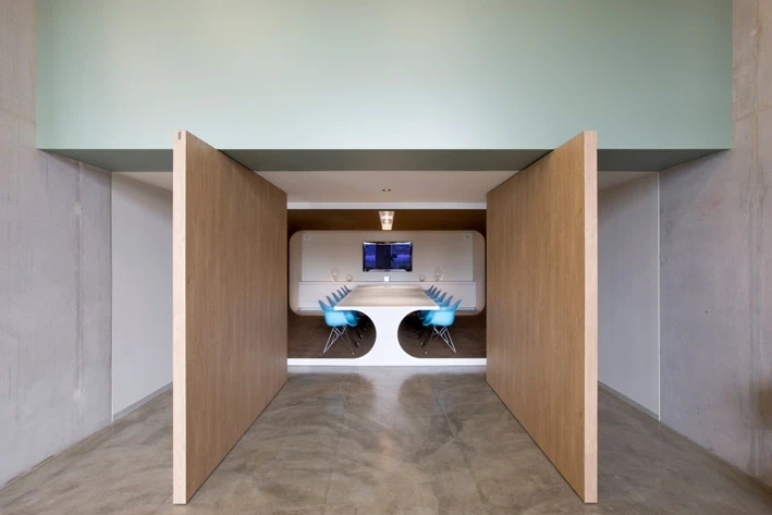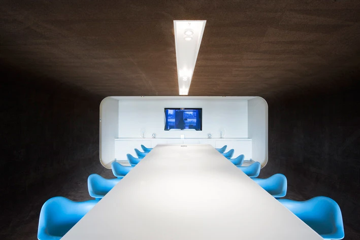 The meeting room - floor, walls and table carpeted as it being one single object - with its fluid lines resembles a futuristic grotto. Large wooden pivot doors separate meeting room and hall.