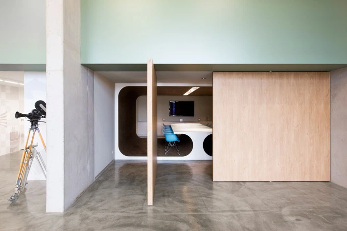In his design Mentjens took the existing concrete structure, and more specifically the large concrete columns, as his point of departure. The distance between the columns defines the dimensions of the subsequent areas. The width of production room, meeting room and staff room measures the span between two columns, the studio up on the mezzanine measures twice this size.