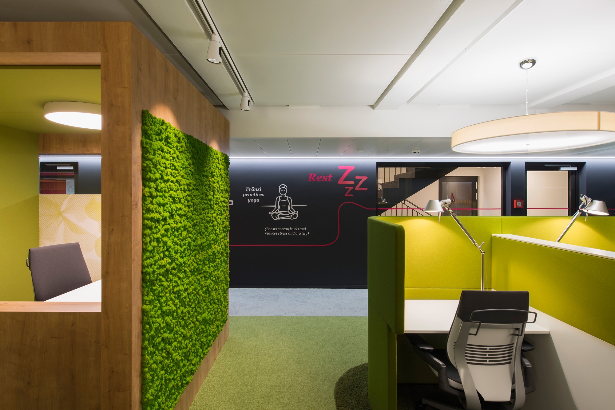 In busy, high intensity offices, workspace design can also have an important role to play in creating a positive mindset and improving mental health. At PwC Switzerland’s office in Basel, Evolution Design focused on empowering employees as a way to help manage stress levels and increase energy levels. The office space offers a wide choice of working areas and employees are free to choose the kind of work environment that best suits their mood and task at any given time – whether that’s meeting in a think tank, working at the bar in the sociable coffee zones or using a phone booth for greater privacy when making phone calls.