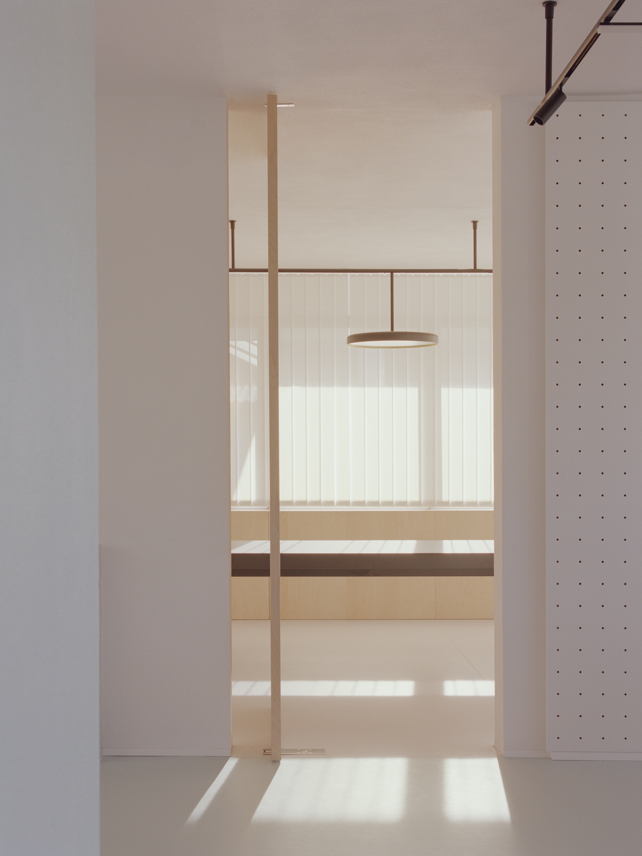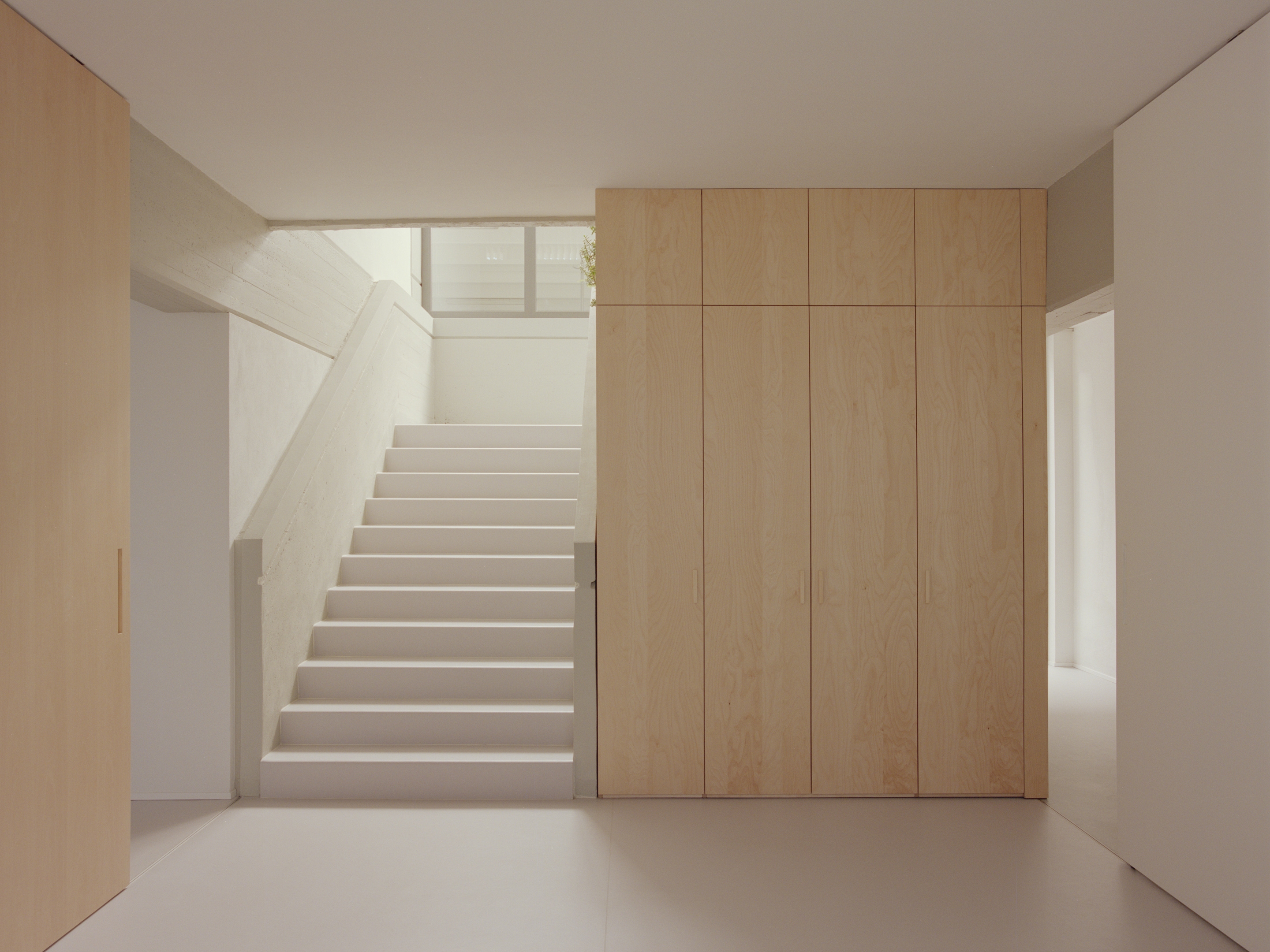 As well as acting as a container, these elements give the rooms a hierarchy and allow them to be separated through integrated sliding walls. The offices, that required more privacy, as well as the employee toilets and the server room, have been placed in the southern service strip between the entrance and the staircase to the first floor.