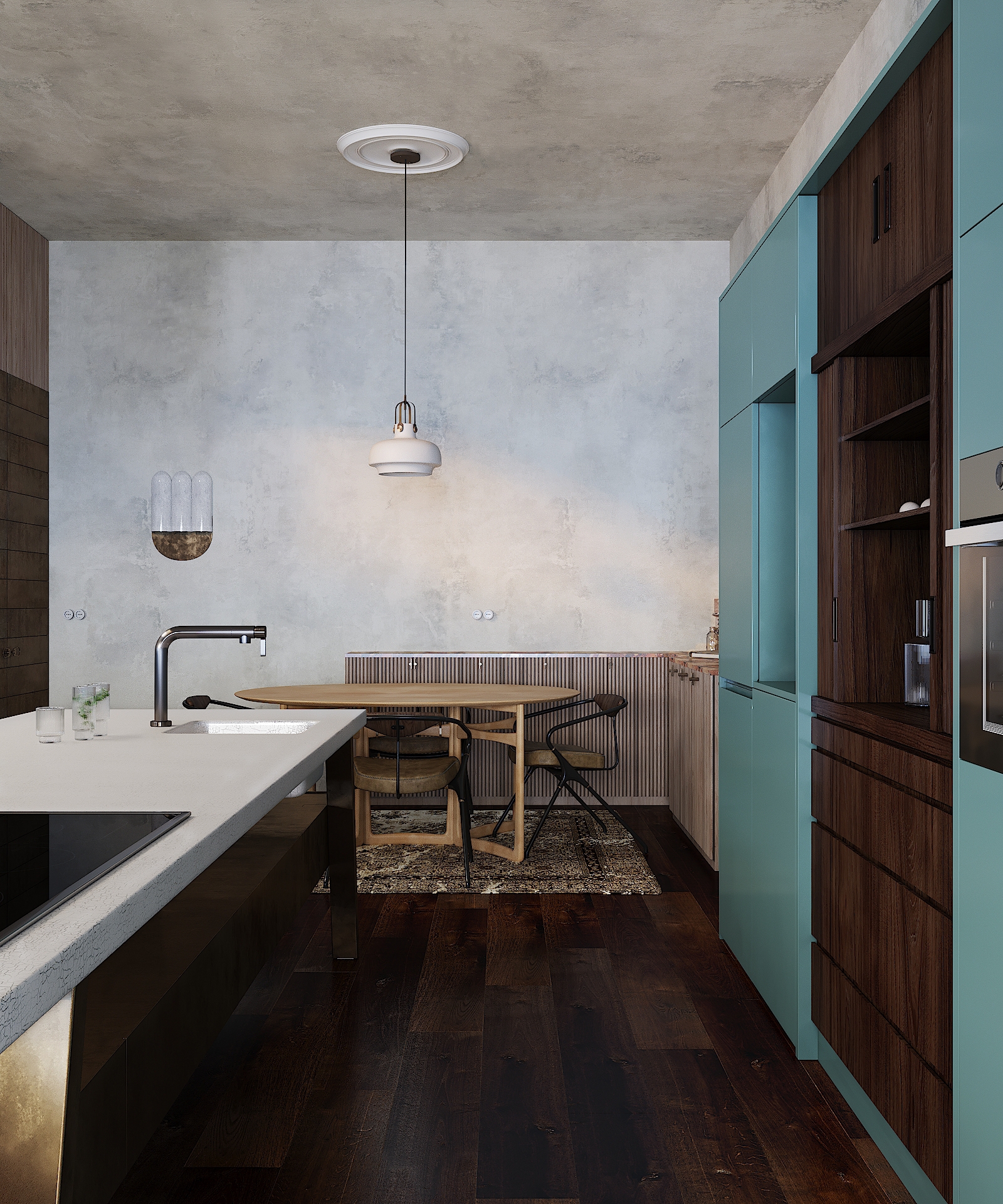 The feel of an urban oasis is enhanced by a richly textured palette of handmade and natural materials, such as warm white plaster finishes, hardwood floors and marble surfaces. Wall sections painted in a subtle blush and bolder turquoise add colorful accents, a series of bronze fixtures, including pendant lights and modernist sconces by Emmanuelle Simon as sculptural highlights, infusing the home with exuberance. The result of such a thoughtful and meticulous design process is a residence of timeless sophistication that nonetheless feels fresh and modern.