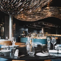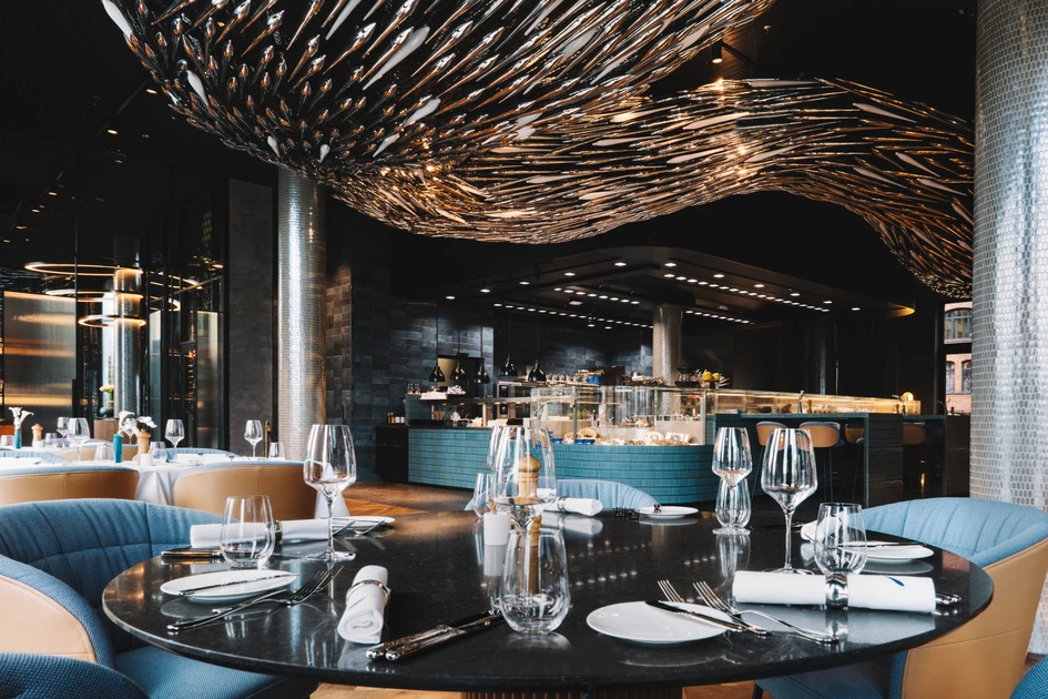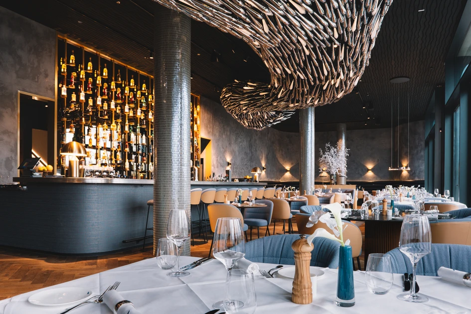Talking about a statement: 4.35m clear room height, 400m² restaurant space with 144 seats and the show kitchen are a real acoustic challenge – and at the same time an invitation for the monumental, moving installation. A work of art. 30 meters long. 2,600 silvery fish, translucent mirror glass, super delicate, mouth-blown, each one a unique piece. Together they form a gigantic school of fish, delicately gleaming and apparently moving as if going to disappear in the green inner courtyard with another 80 seats for guests. High-tech and artisanal know-how intertwined; thus, the 3-D data provided by GEPLAN DESIGN could be directly used for the construction by the luminaire manufacture Missal Objekt Licht GmbH & Co. KG.