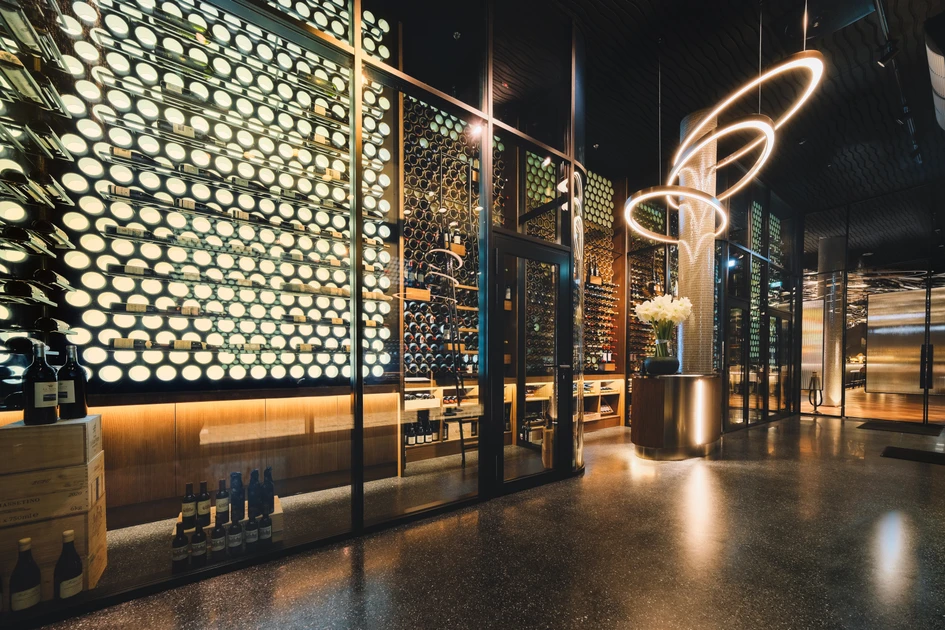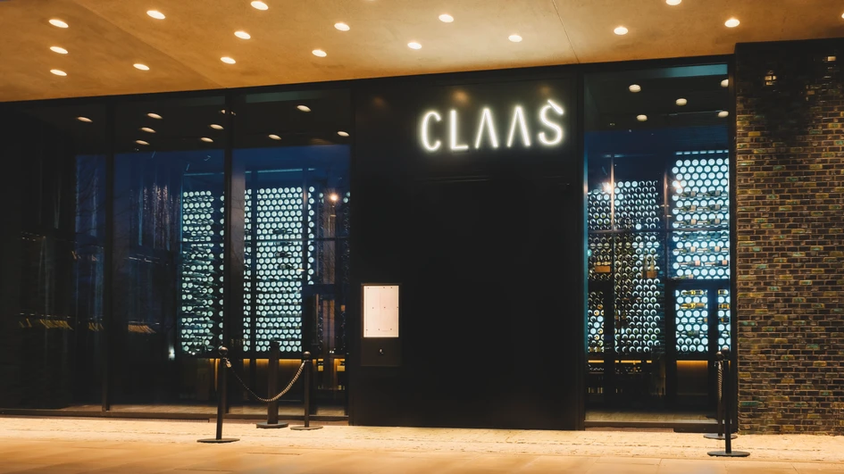 Wine to go with it? The wine house is a clear statement, characterizes the generous entrée where the Maître welcomes the guests. The bottles shimmer in golden, illuminated tubes, the smooth room divider made of moving black metal scales separates the wardrobe. A grand gesture that is not found anywhere else – in the CLAAS one is invited exclusively and discretely. A shimmer behind the steel loft door gives a hint of more to come.