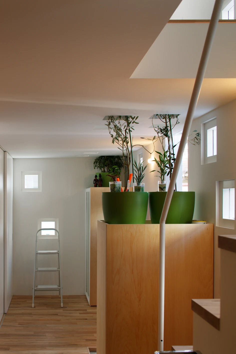 The house is a simple “box,” comprising two stories above ground: two small rooms on the first floor, a large room on the second floor, and a rooftop. Small windows the size of 200m by 200m were randomly placed on the walls, floors, and the roof. The 200m by 200m openings function as small wellholes on the floor, providing practical punctures that bridge the first floor and the second floor so that the occupants can communicate with one another. Through these small openings, the children can talk to each other, and the parents and the children can talk in sign language. Sometimes, the children drop small toy cars to alert the parents. The openings on the walls pulls in air and light from the exterior and functions as a “communication tool” between the small garden and the interior. Likewise, the punctures between the rooftop and the second floor and between the rooftop and the first floor can also be used for communicating by sign language, not just for daylighting. Moreover, four to five 200m by 200m openings are grouped together to allow plants placed on the first floor to branch out through to the second floor. These 200m by 200m punctures function as conduits for humans, plants, wind, light, and communication, freely expanding throughout the interior and the exterior of the small rectangular house.
