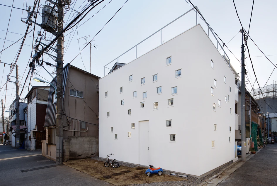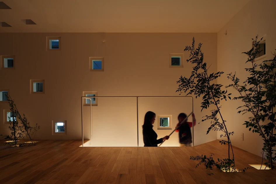 If you cannot hear, you can communicate by sign language. Communication by sign language can freely transcend the windows that separate the interior and the exterior. In this house, the small 200m by 200m openings scatter on the floors, the rooftop, and the walls, letting the children, the hearing-impaired parents, plants, light, and wind to circulate full of life from the interior to the exterior. The house is very free, light, and filled with happiness.