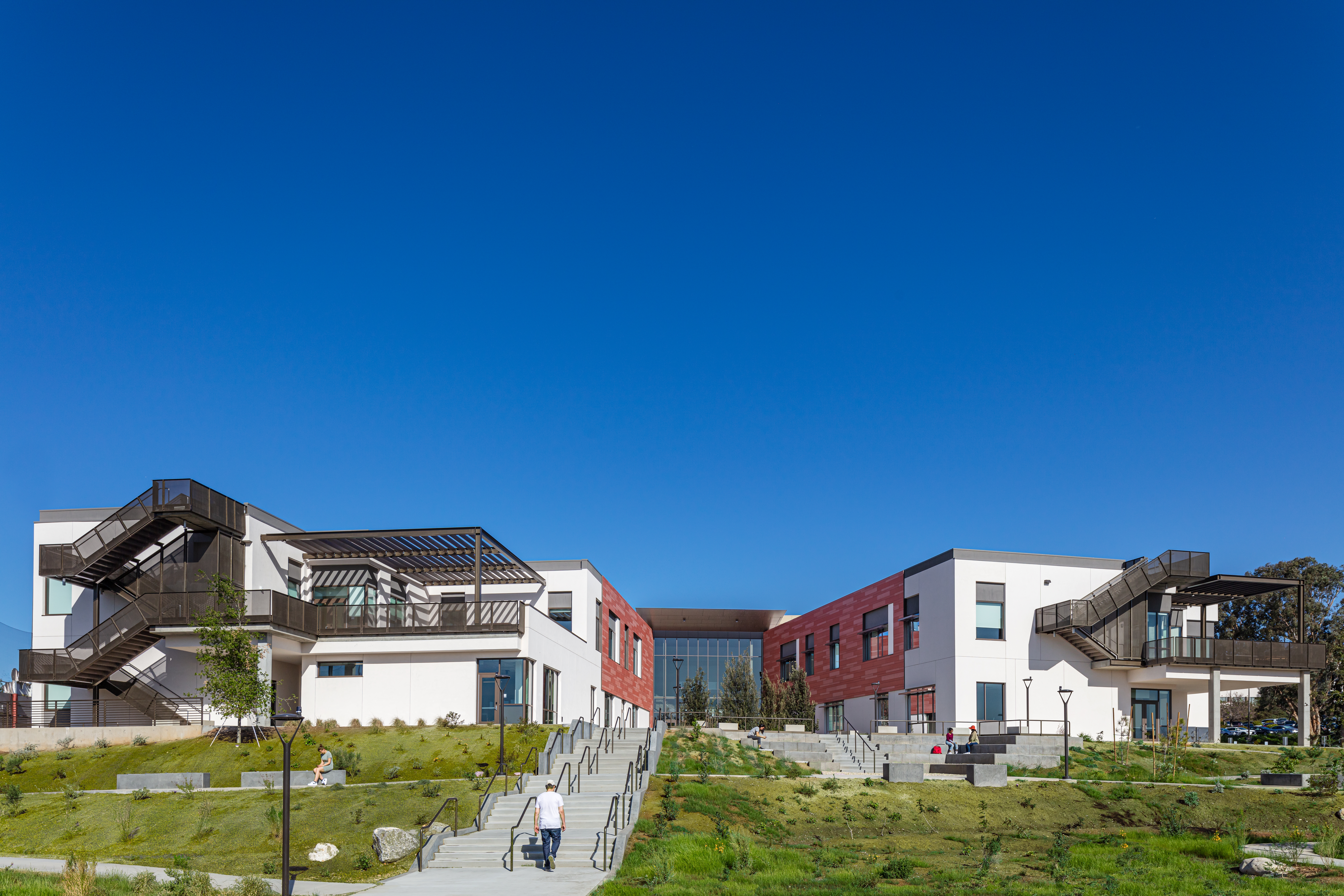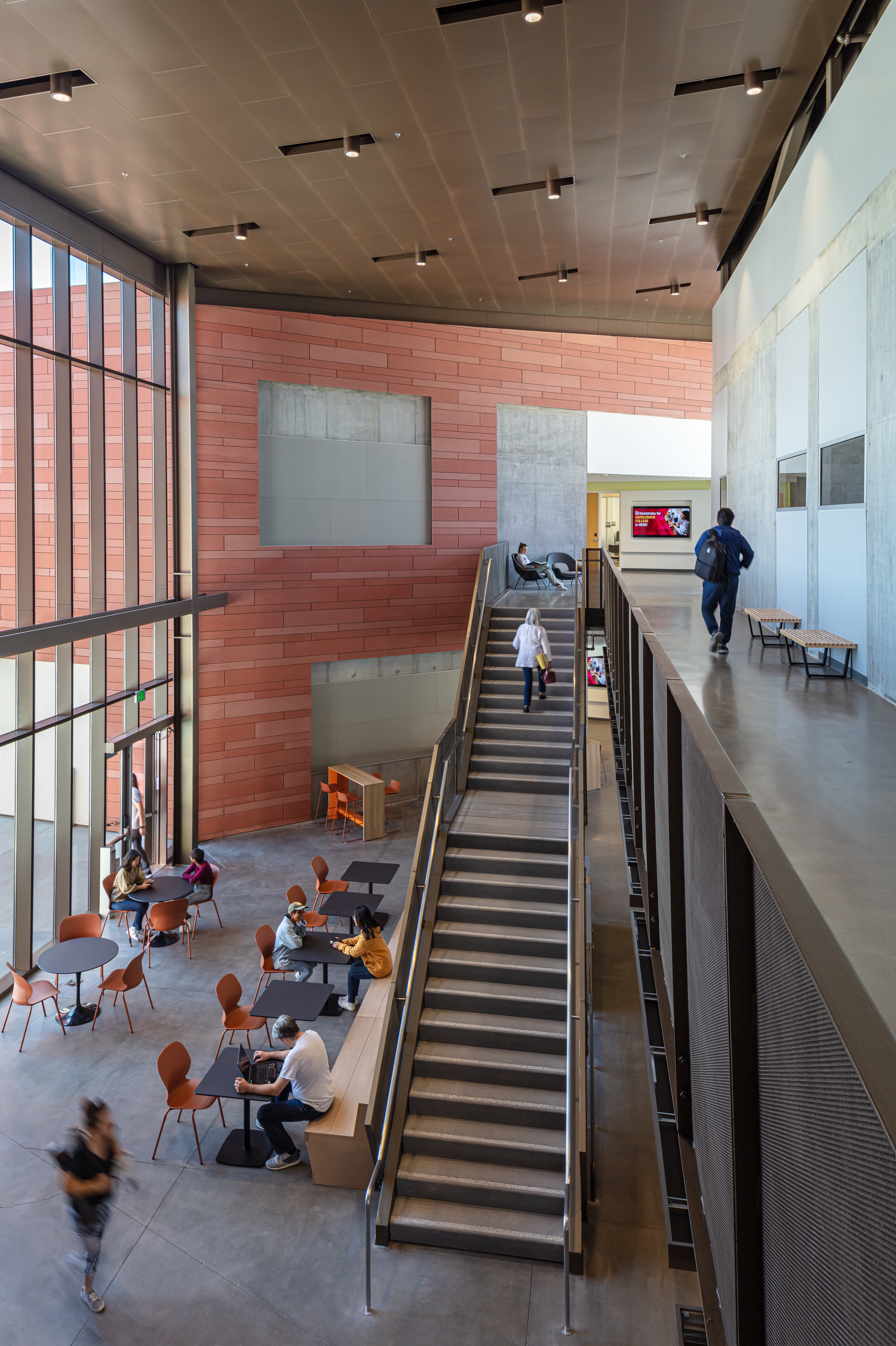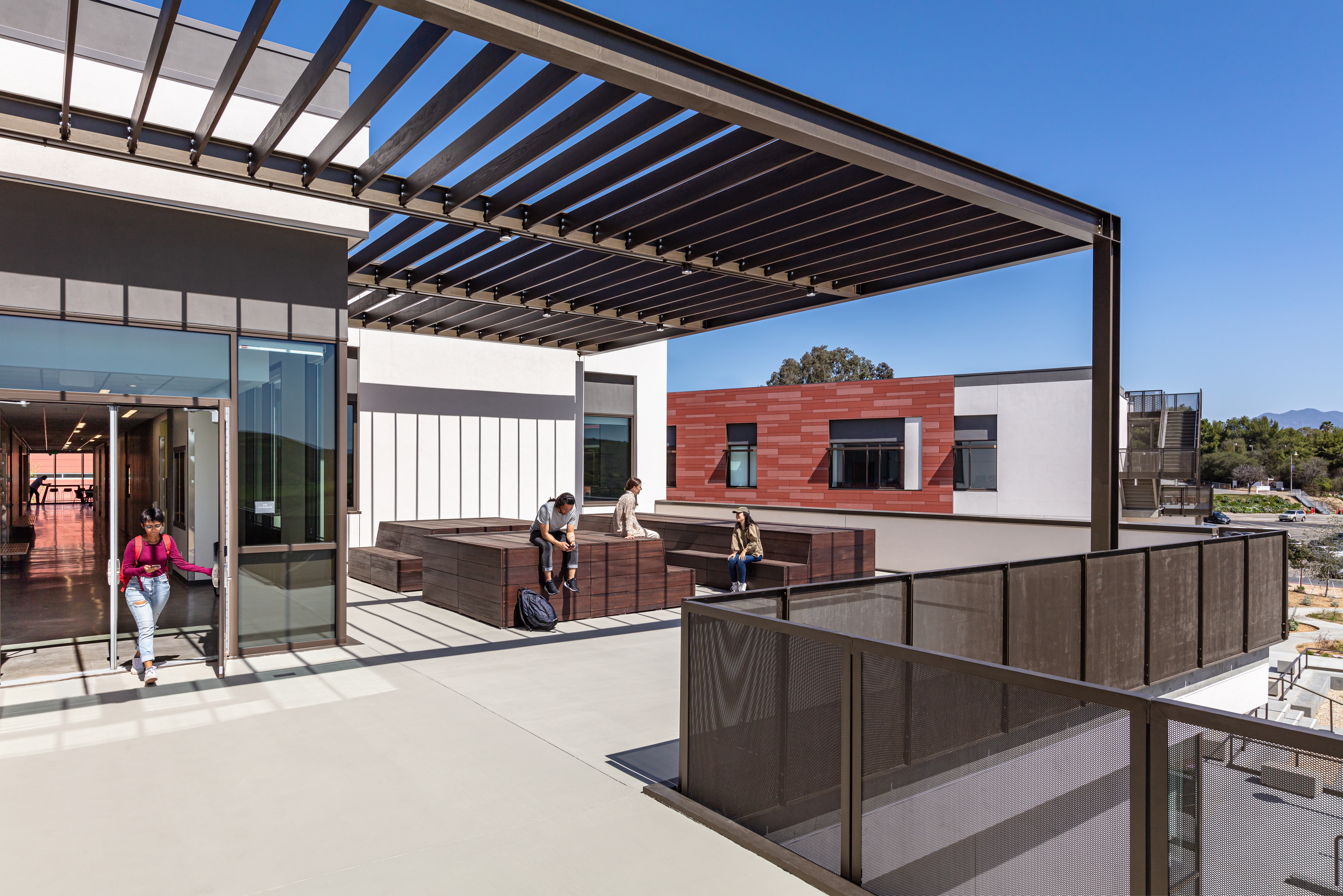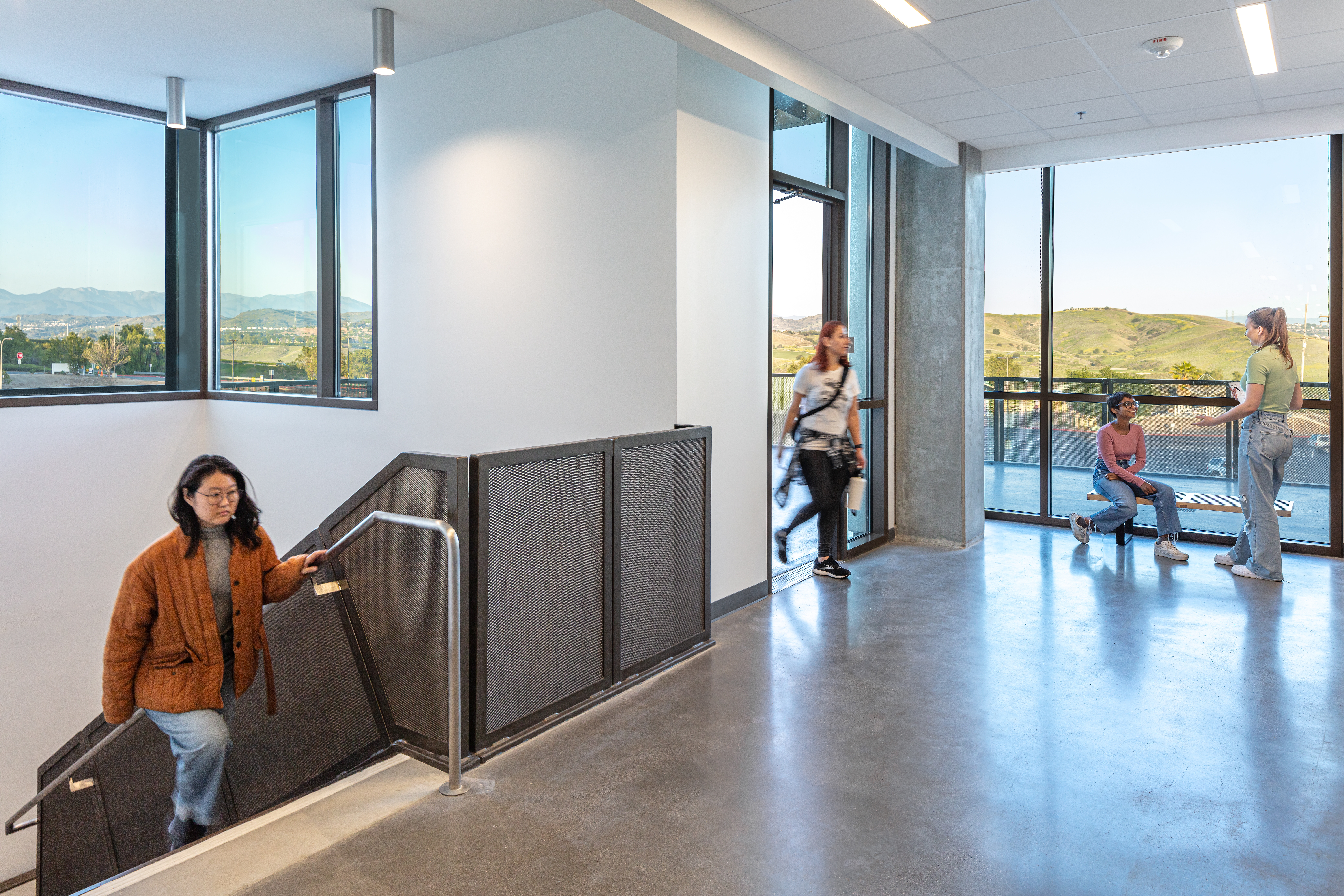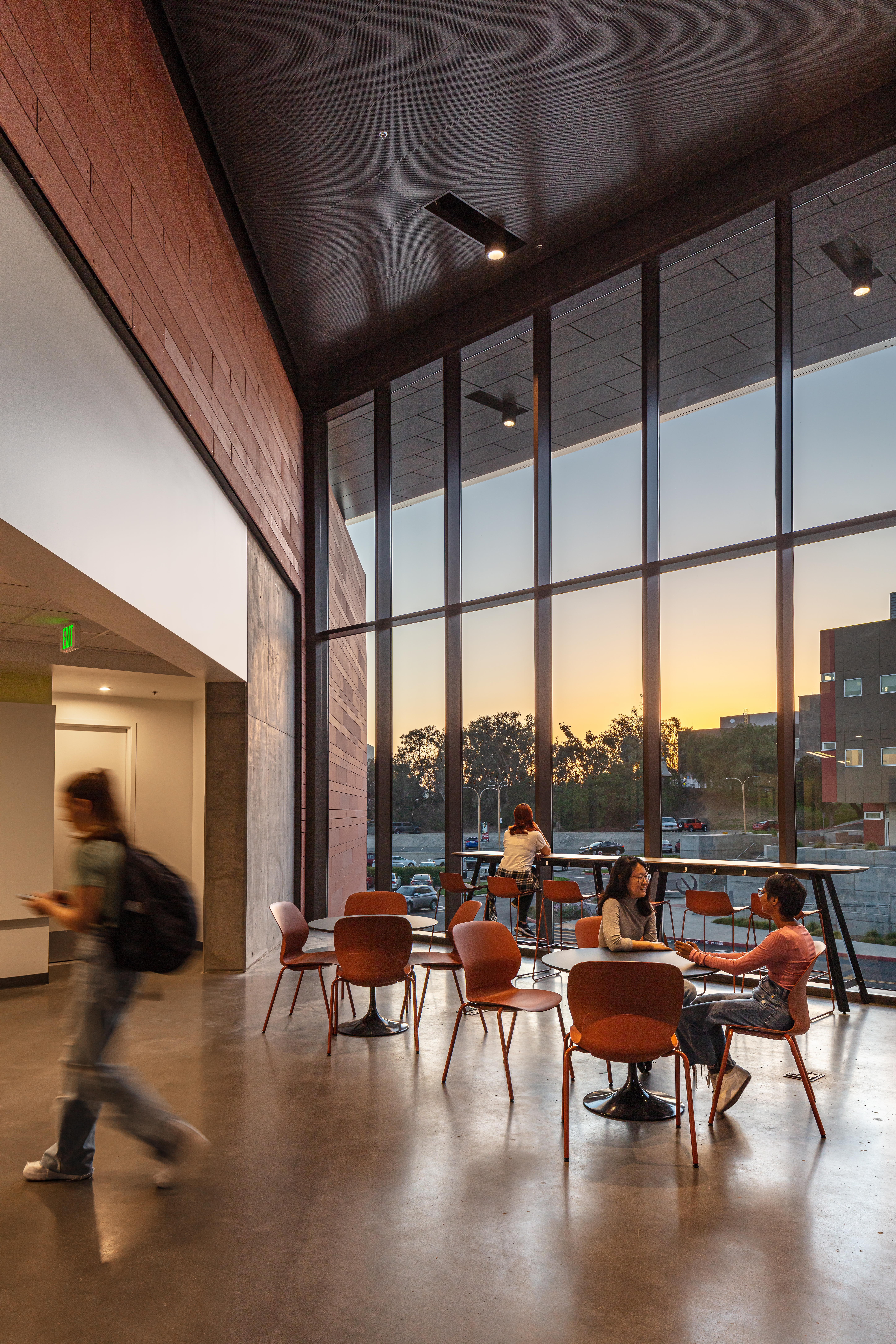 Upon arrival, dual funnel-shaped entry porches contain benches, hardscapes, and fanning lines that originate at the entry doors – focusing the approach and shifting attention towards labs, classrooms, and the courtyard green. A terra-cotta wall moves with visitors from exterior to interior, slipping through a glass plane; uniting the entry porch and the social hub – the collaborative heart of the building. That same wall weaves into the eastern courtyard where an amphitheater embraces expansive views of the Trabuco Arroyo and Santa Ana mountains.