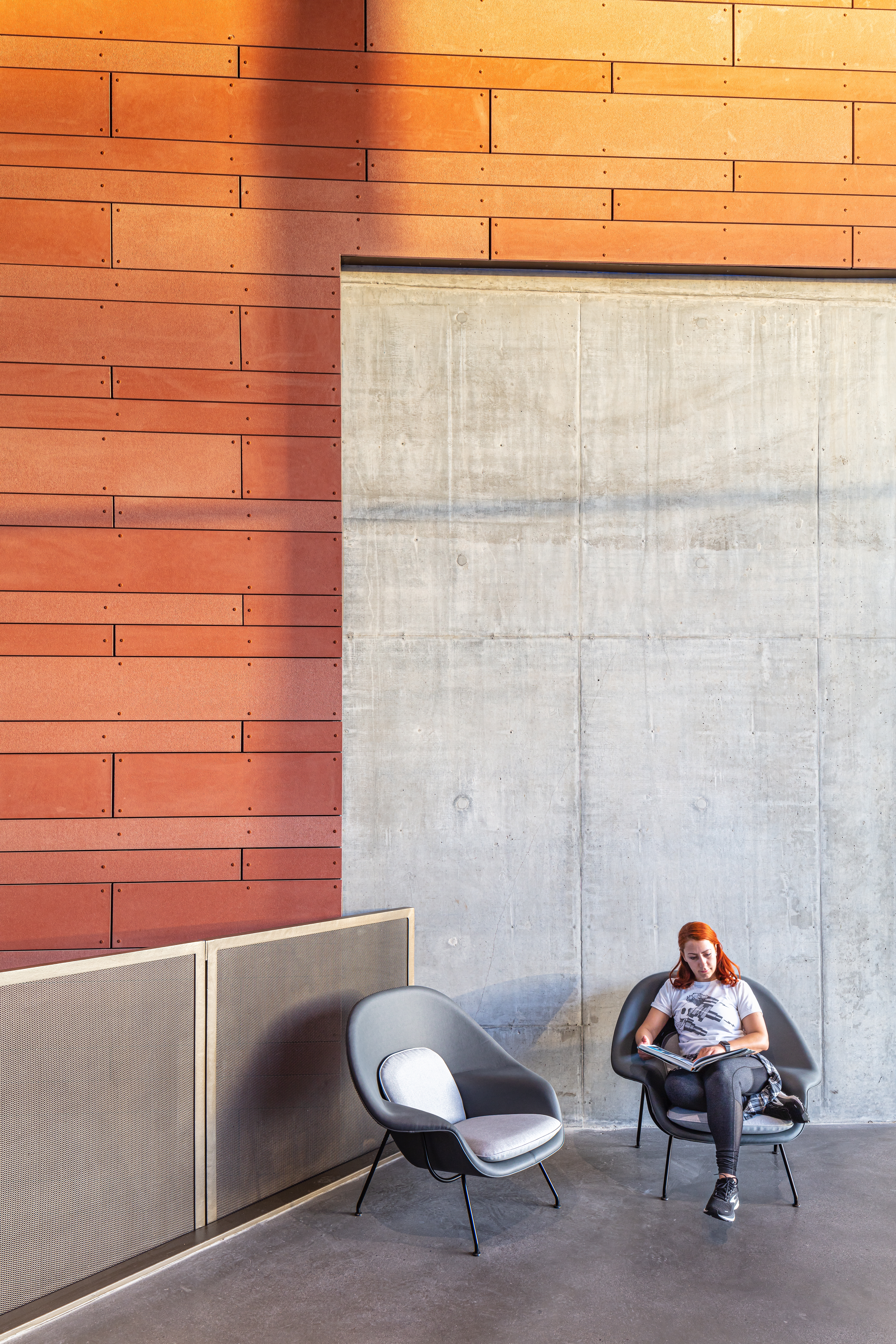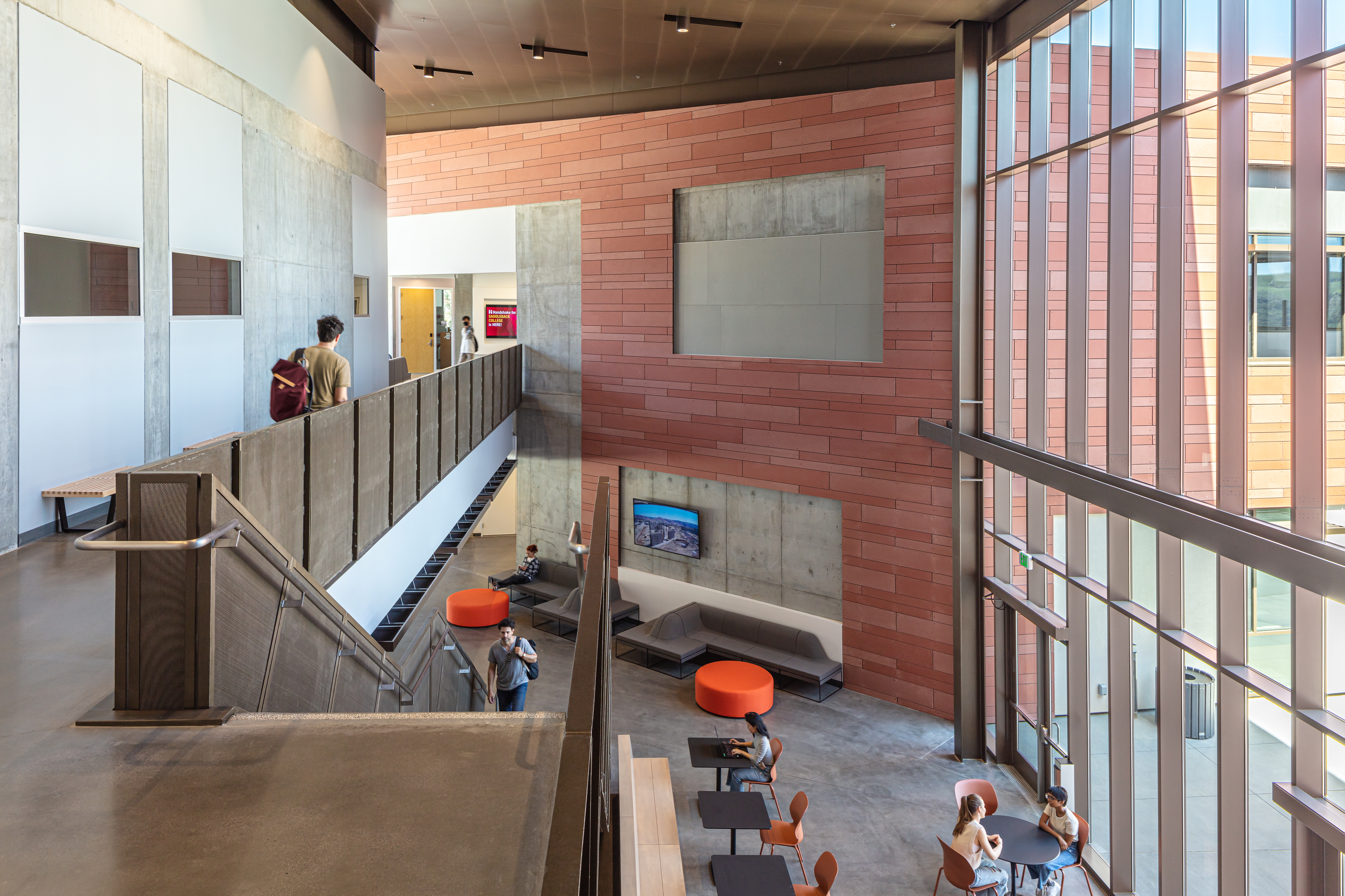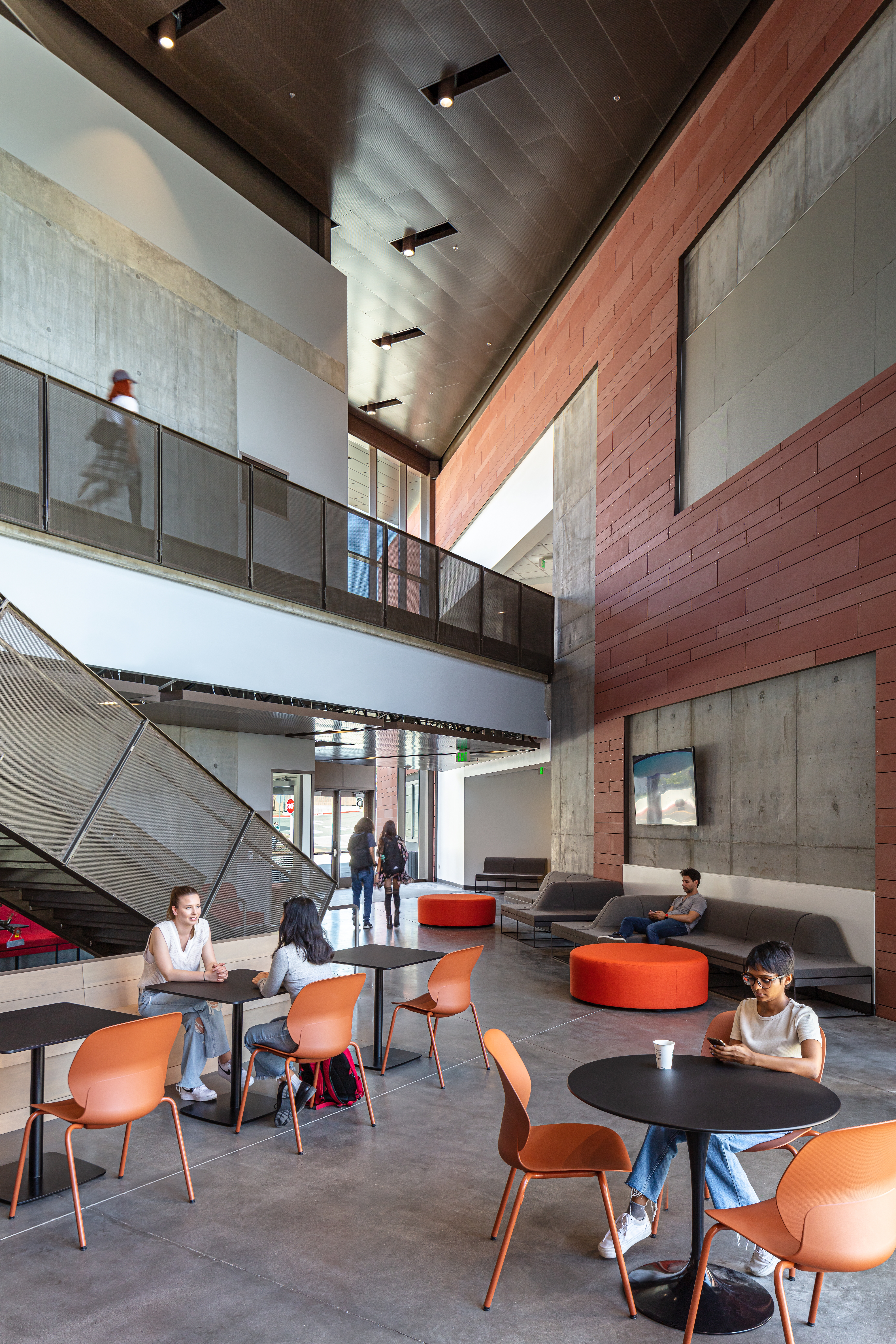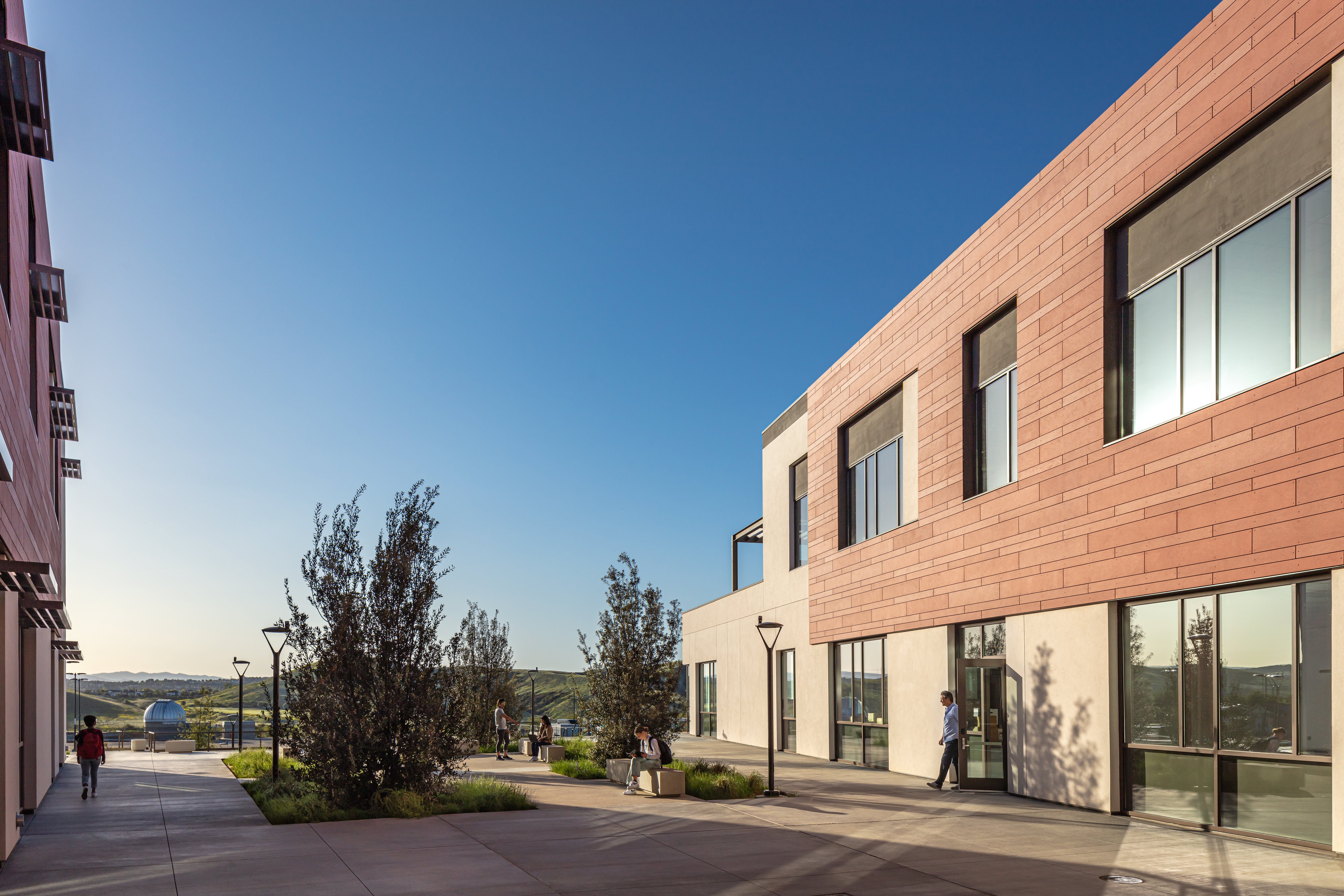 Upon arrival, dual funnel-shaped entry porches contain benches, hardscapes, and fanning lines that originate at the entry doors – focusing the approach and shifting attention towards labs, classrooms, and the courtyard green. A terra-cotta wall moves with visitors from exterior to interior, slipping through a glass plane; uniting the entry porch and the social hub – the collaborative heart of the building. That same wall weaves into the eastern courtyard where an amphitheater embraces expansive views of the Trabuco Arroyo and Santa Ana mountains.