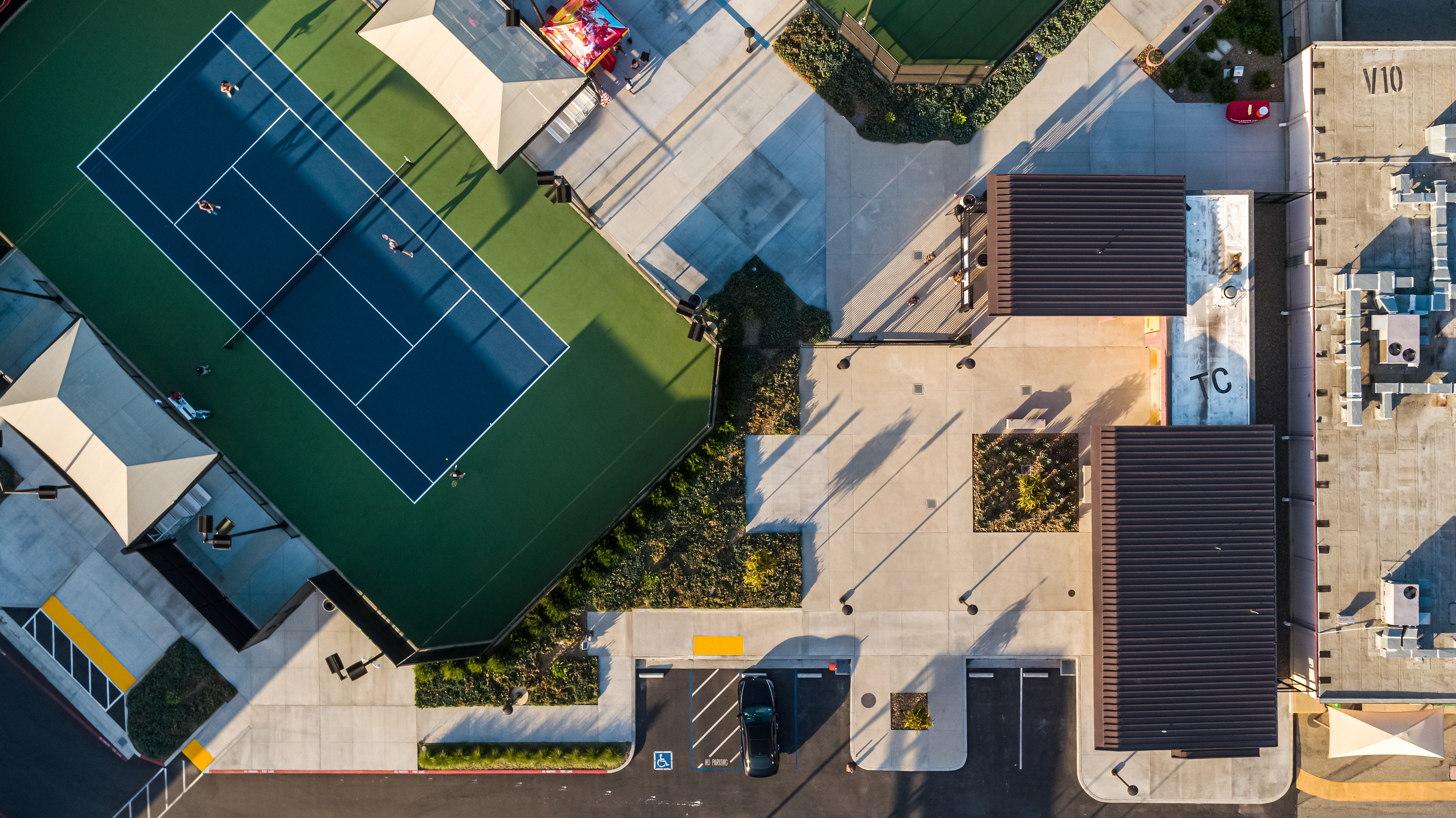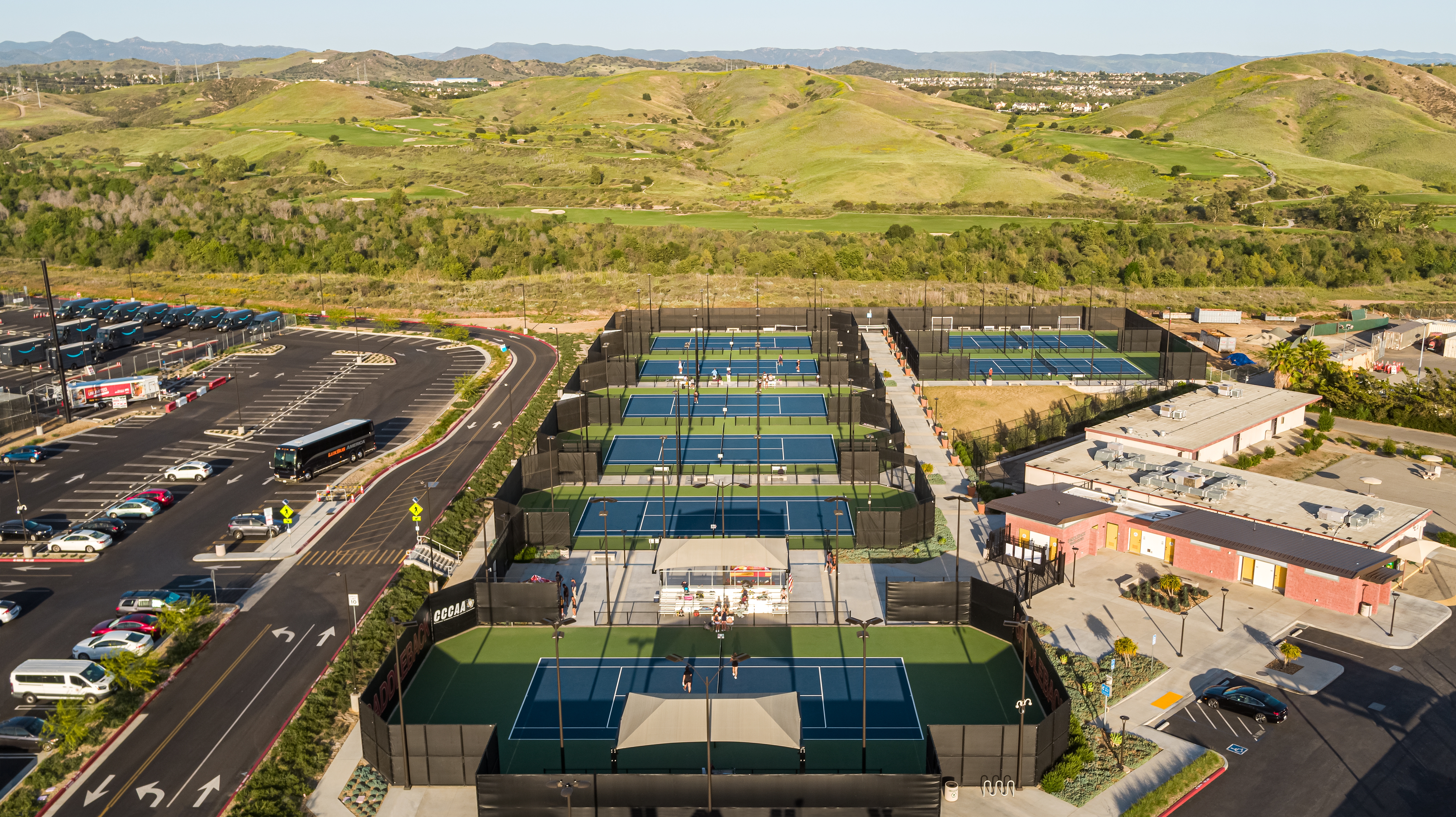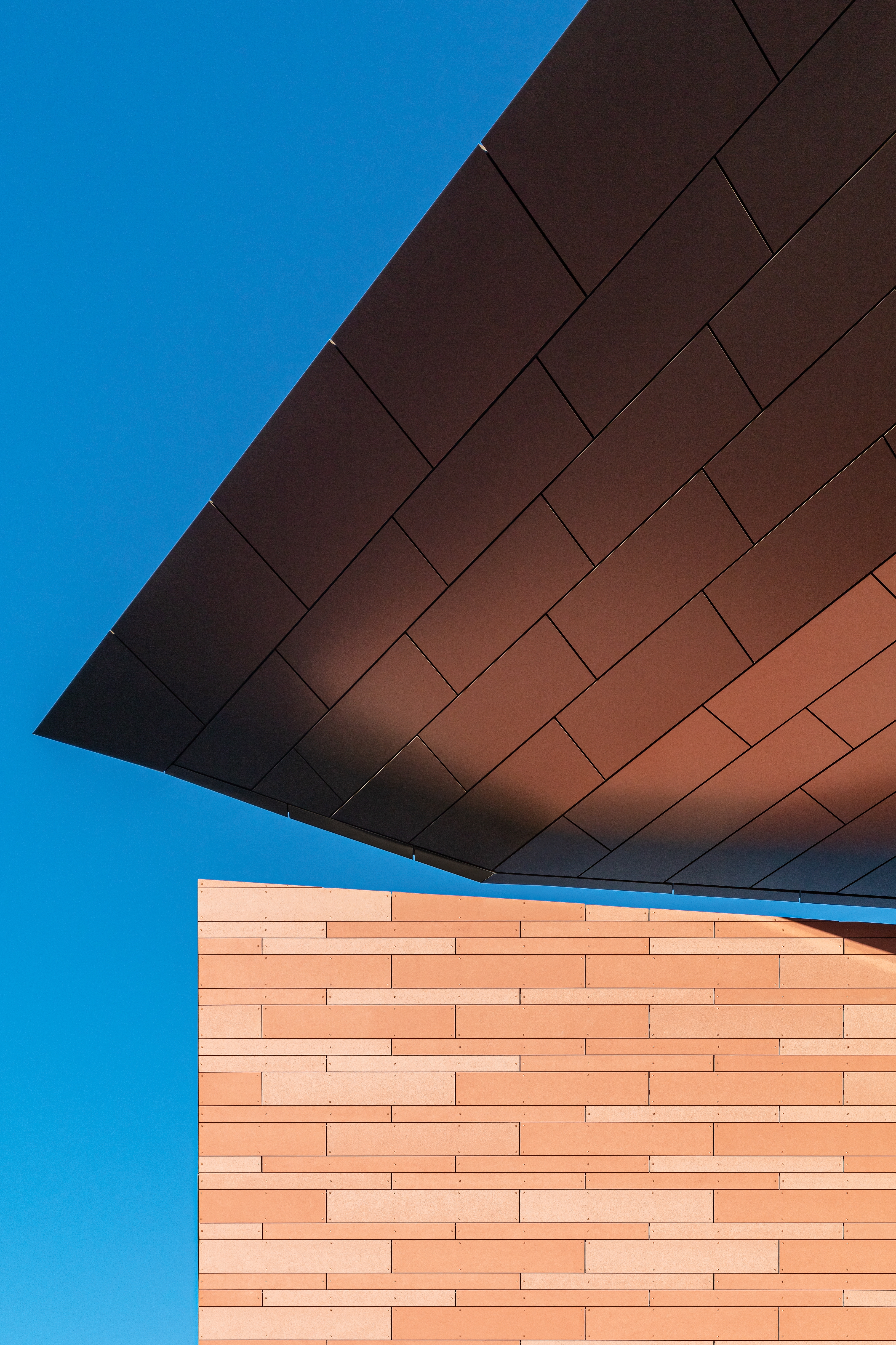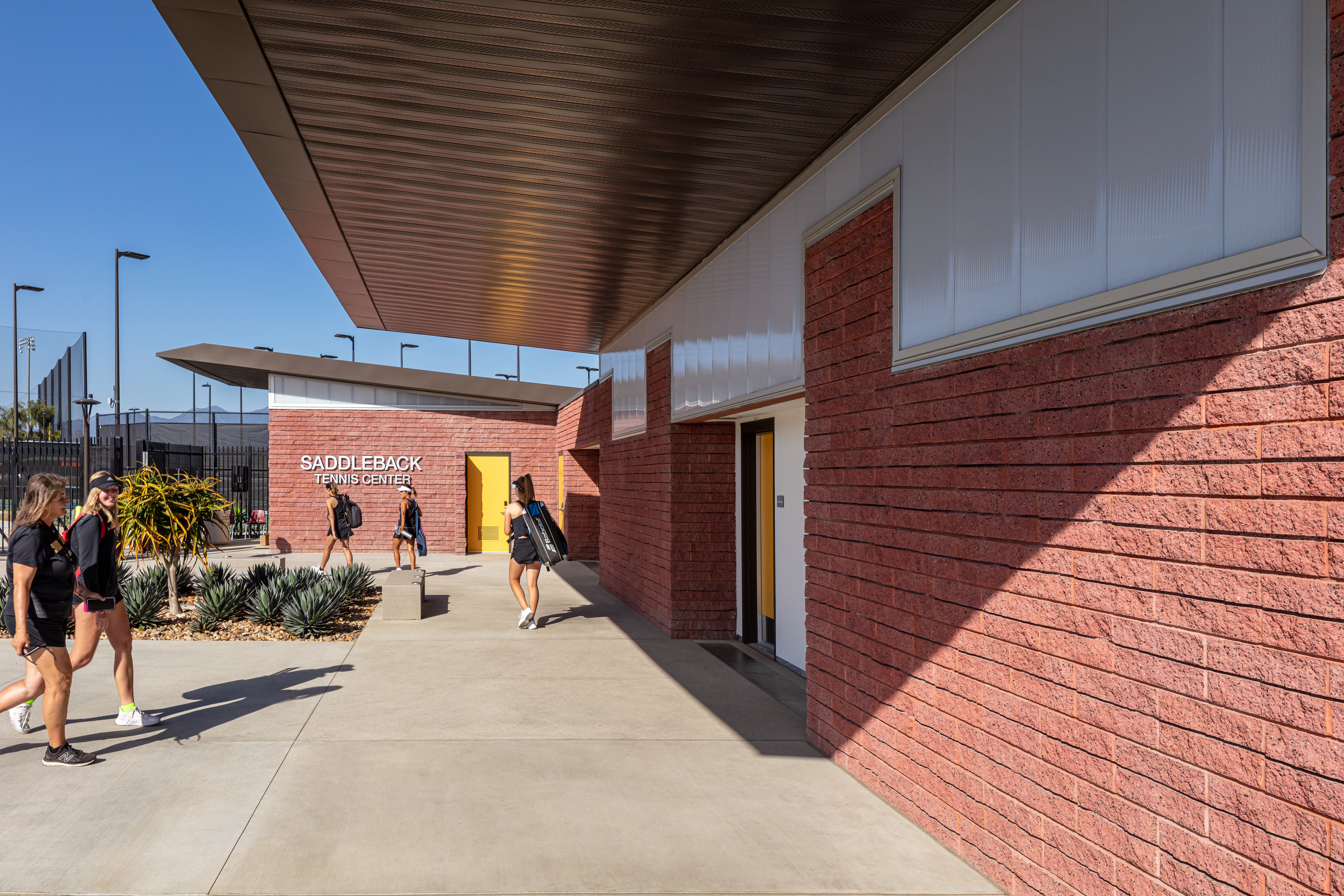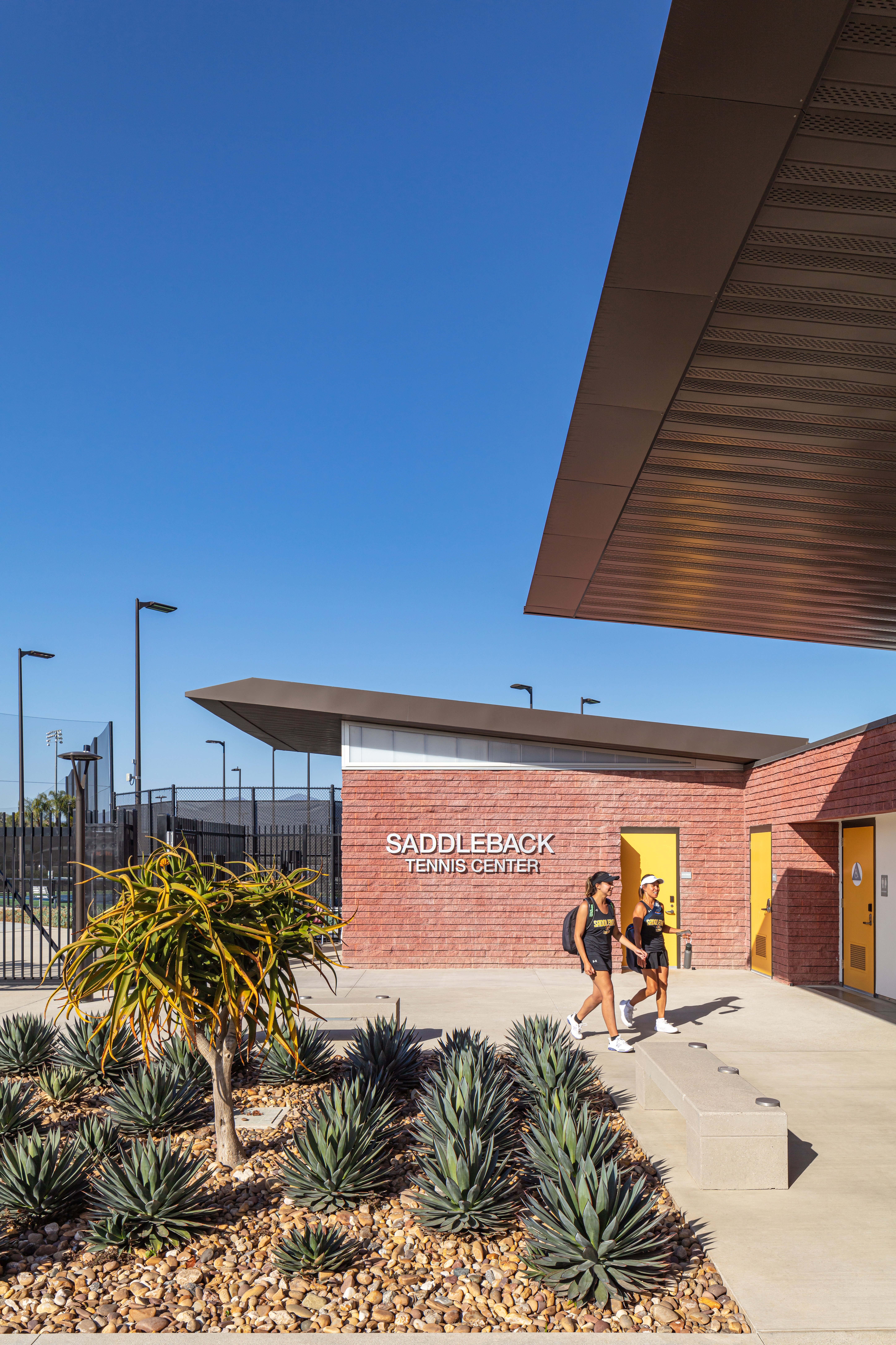 Upon arrival, dual funnel-shaped entry porches contain benches, hardscapes, and fanning lines that originate at the entry doors – focusing the approach and shifting attention towards labs, classrooms, and the courtyard green. A terra-cotta wall moves with visitors from exterior to interior, slipping through a glass plane; uniting the entry porch and the social hub – the collaborative heart of the building. That same wall weaves into the eastern courtyard where an amphitheater embraces expansive views of the Trabuco Arroyo and Santa Ana mountains.