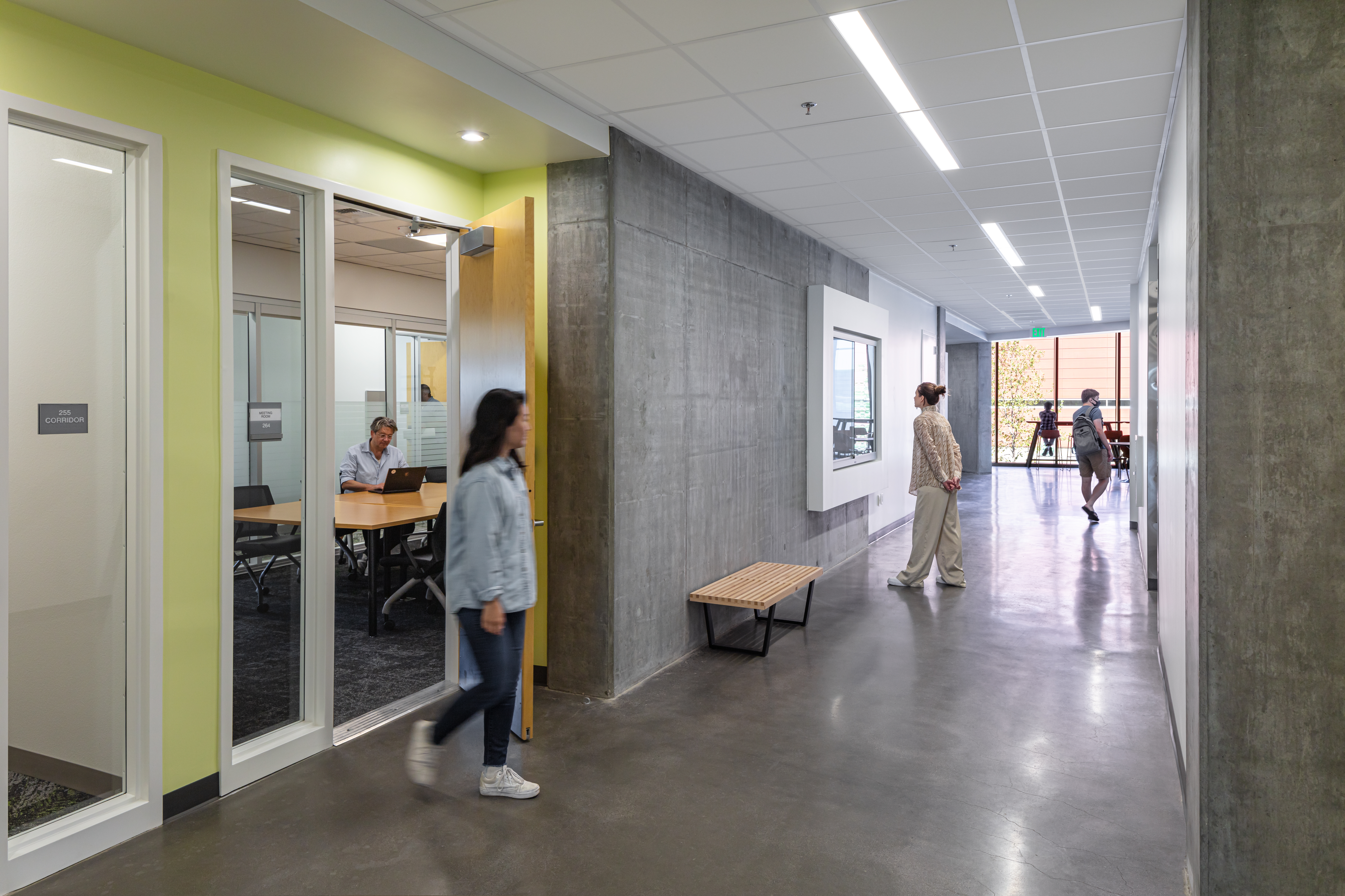 Exposed building systems and transparent maker and exhibition spaces invite students to encounter ideas beyond their own curriculum. Maker spaces are located for maximum accessibility and deep connections to other disciplines and the natural environment. An accessible and highly visible faculty space is located in the center of the social hub along with ample impromptu gathering spaces encouraging serendipitous and casual interaction of students, staff, and faculty both in and out of classrooms, fueling a spirit of openness and collaboration.
