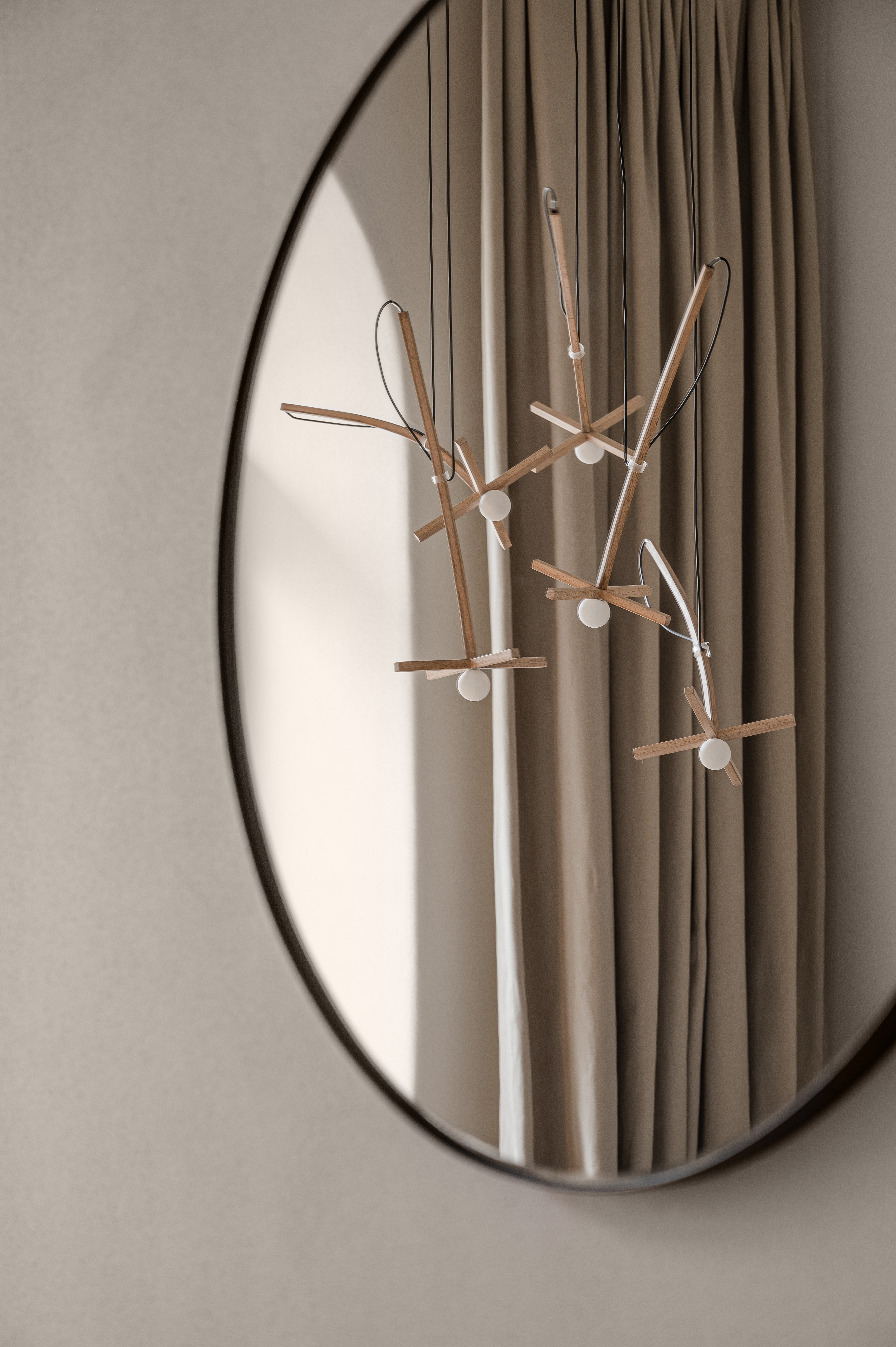 To the left of the entrance hall is the kitchen, storage and meeting room. This room is designed for comfortable communication between VIP-clients and Ruslan's team. In the center of the room attention is drawn to a custom-made elegant wooden chandelier «Spirits» by Vasya Grublyak. Along the wall there is a console and shelf for accessories and goods from seasonal collections.