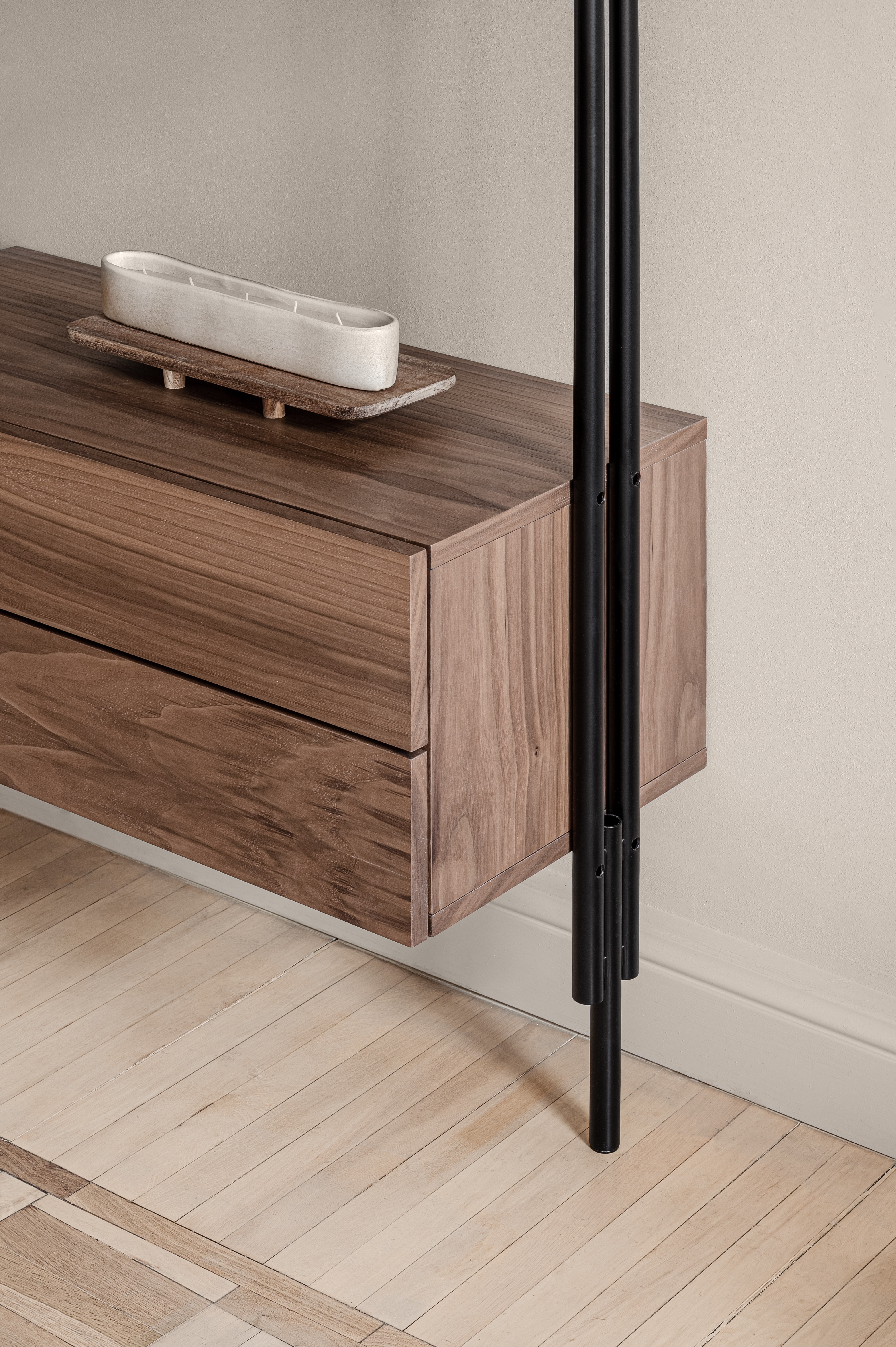 The room we worked with was filled with history. To retain the old time we kept the existing molding and invited an artist to enhance its features by drawing the depth of the patterns’ shadows and producing a worn-out effect. The inherited parquet floor was restored and covered with a transparent lacquer. We emphasized the arched windows with smoothing corners as it was done in the past.