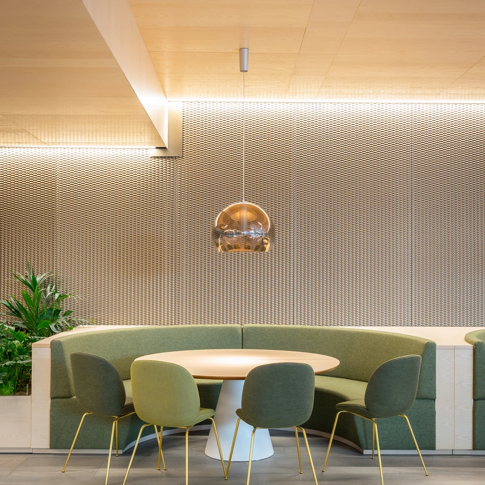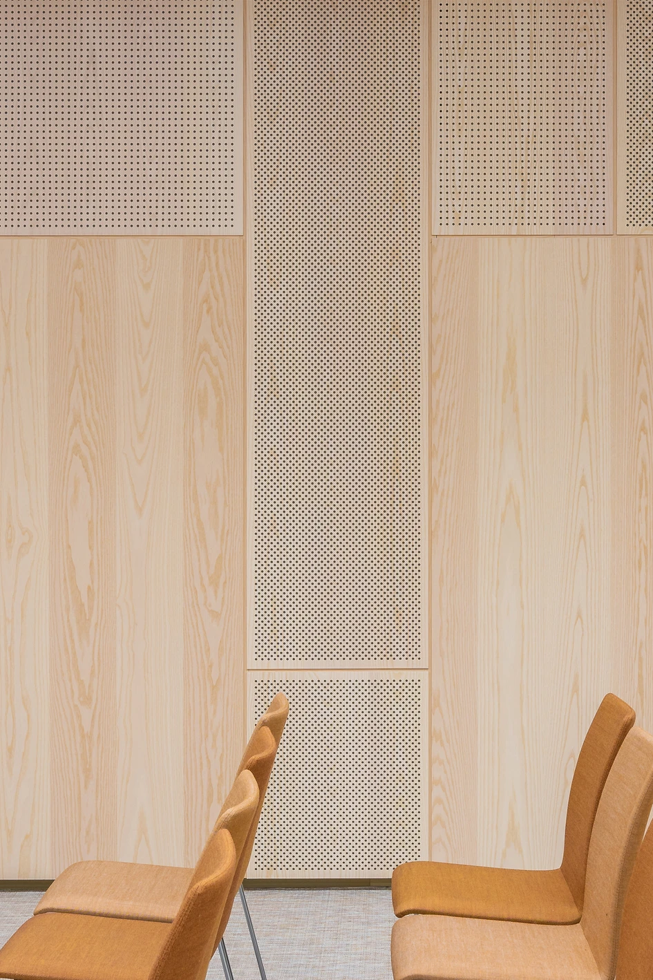 The ceilings in the office complex are installed with our Gustafs Nano panel, in white pigmented ash veneer. The ceilings have also been installed with different bespoke solutions for ventilations, integrated lighting and for technical components. At some places a suspended ceiling is used to give place for the ventilation system.