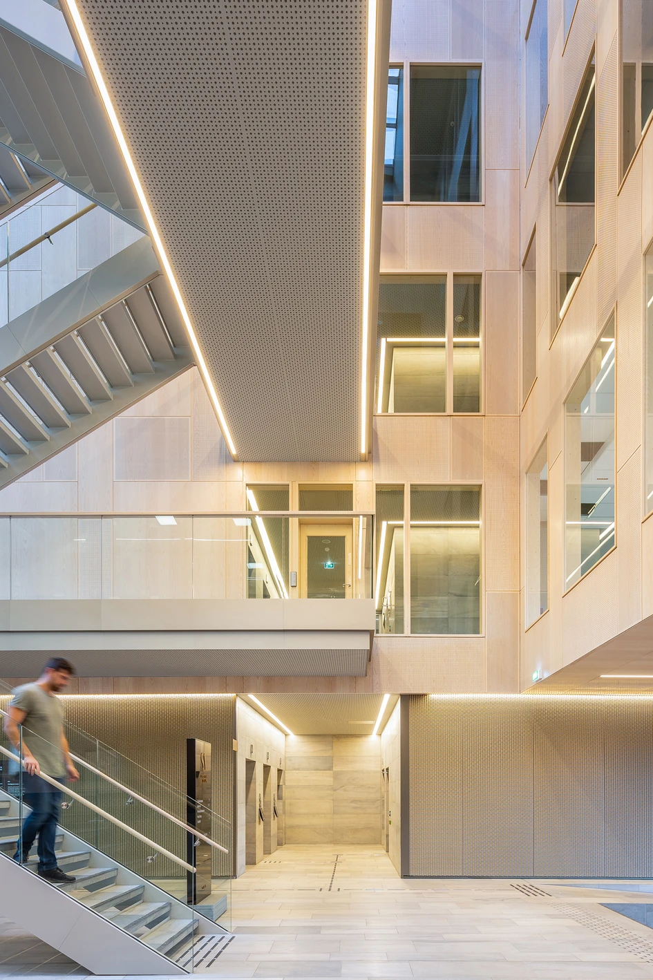 The fantastic atrium extending over several floors has been cladded with three different types of acoustic wood panels: Gustafs Nano, Acoustic panel PD8 and Acoustic panel PH8, mounted in a strategical formation to optimize soundabsorption. Despite the differences in design, Gustafs Nano and Acoustic Panel PD8 achieve the same absorption class – Class B.
