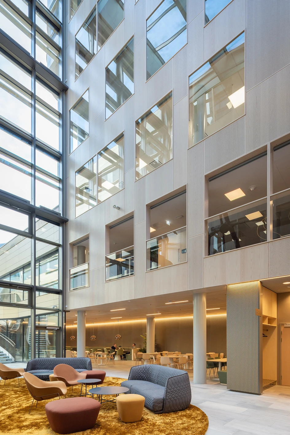 The entire building revolves around the large atrium that extends several floors up. The atrium contributes to a fantastic light input that is reflected in the light wood interior from Gustafs.