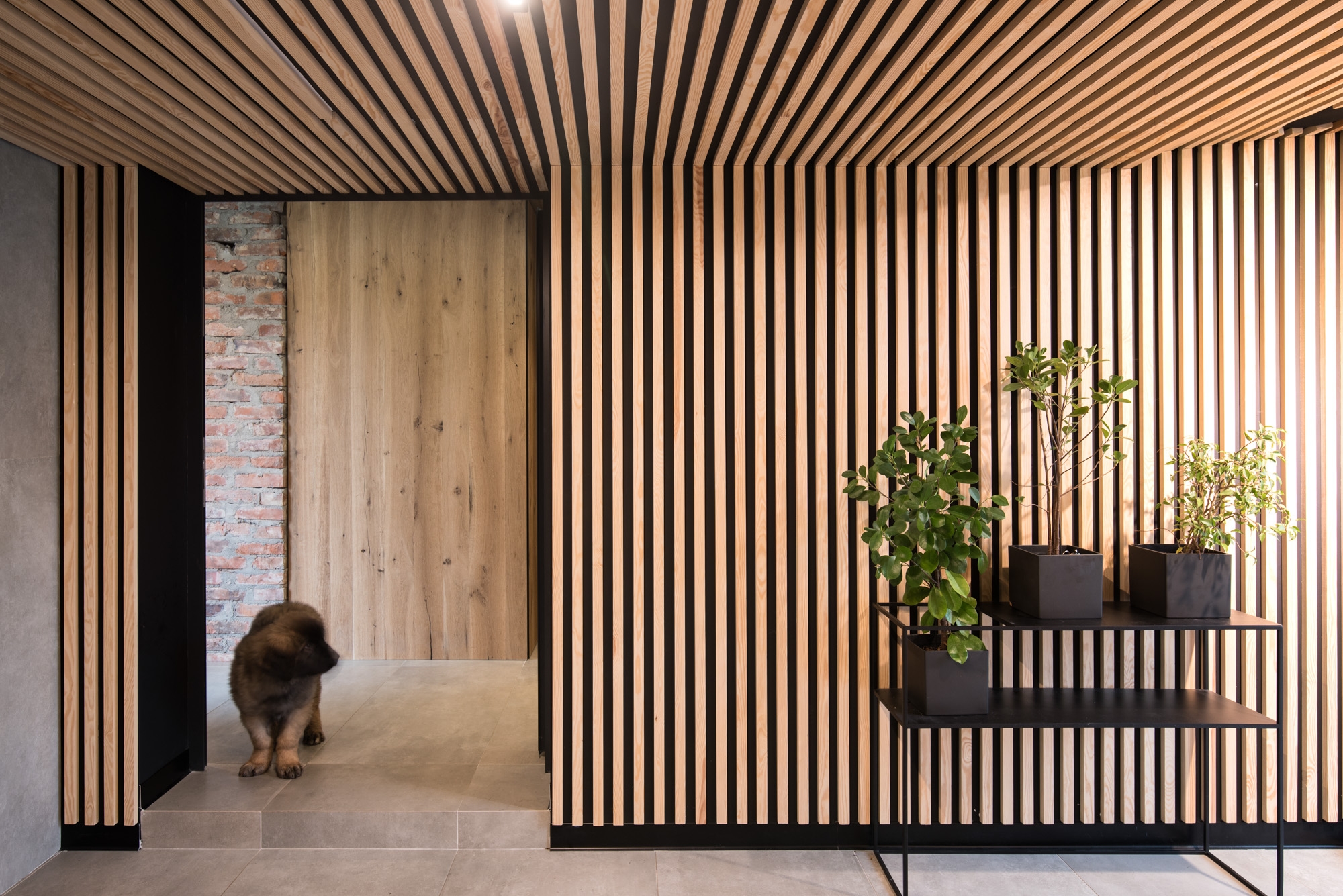 In the interior natural and minimalist finishing materials such as beautifully grained wood and dark polished granite contrast well and complement each other with visible robust materials like uneven bricks and untreated concrete with visible cutting marks.