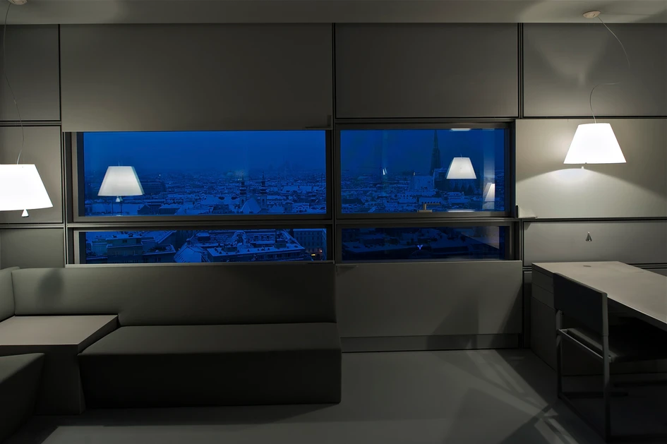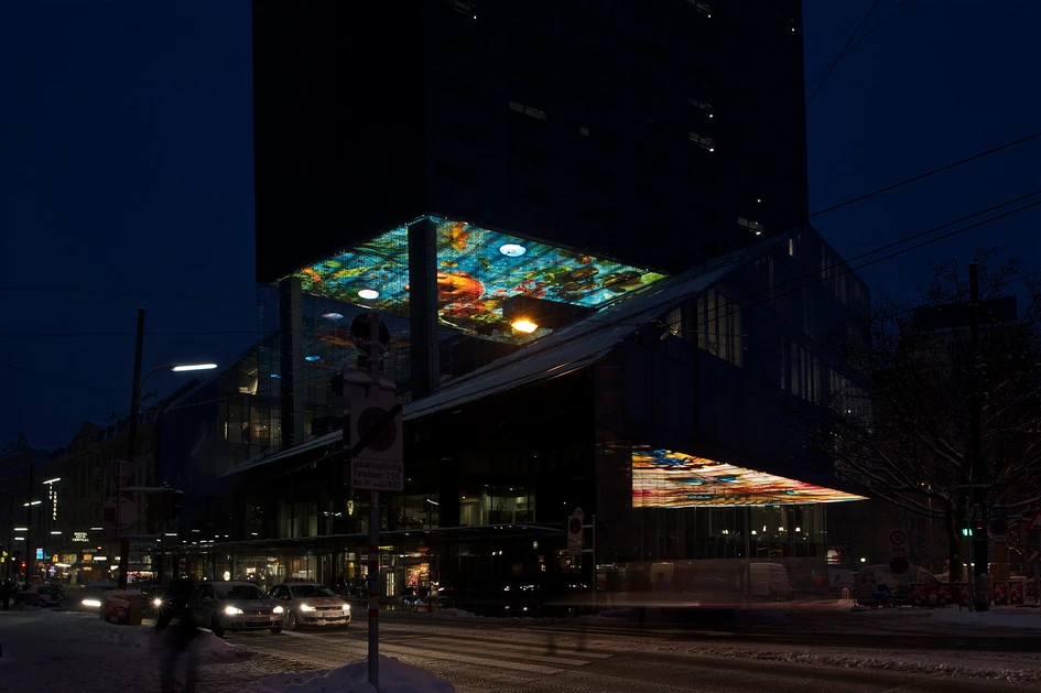 So just imagine that starting with these curious constructible prisms, their planes begin to slide ; intersections are created ; one plane begins to tilt under the magnetic deviance of HH while another decides to light the city from a ceiling made of furtive images. Imagine that the other planes begin to vibrate with a thousand lines of variable orientation and reflectivity, that gray sometimes melts into gray squares on a gray background. It is not surprising then to find that the oblique plan of the roof becomes hatched, weaving a tight, random pattern of parallelograms and lozenges, that the planes to the North take the form of granited glass for transparence ; that the planes to the West cloak themselves in variations of black to display their shadows. At the limit between building and sky there is another, flat plane that reveals the appearance-disappearance of changing faces, an evocation of the multiple faces forever linked to the depth of imagery born of this city.