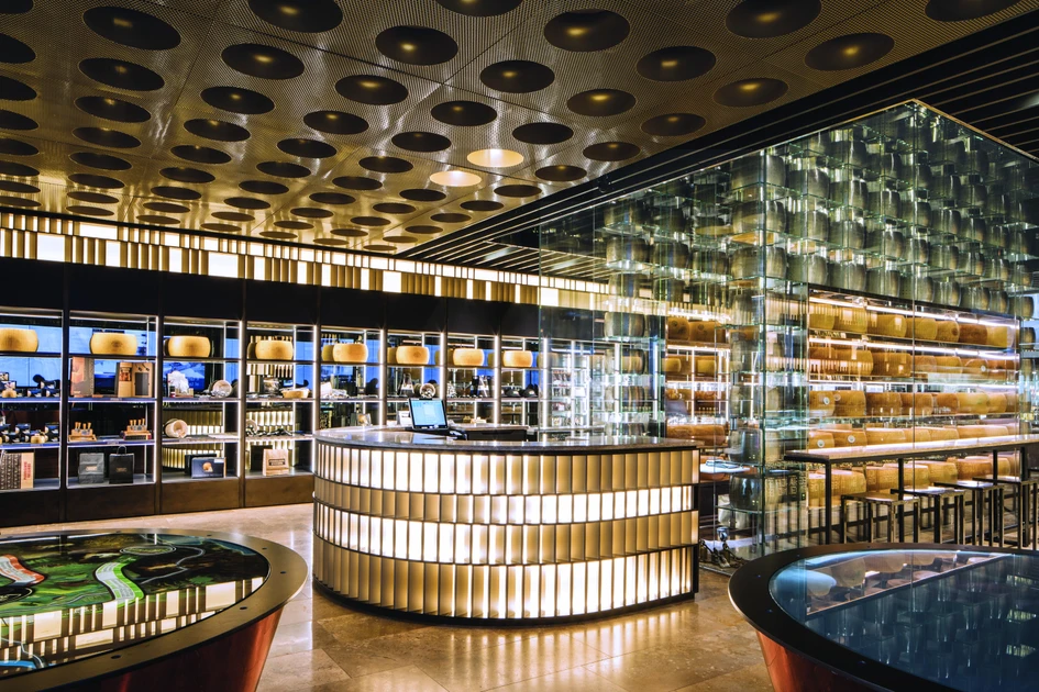 Lo spazio si sviluppa su un totale di 330 mq ca. e consiste di un'area accoglienza e un'area interattiva poste all'ingresso, dal quale dipartono da un lato la zona bar, gastronomia e ristorazione, dall'altro lo store vero e proprio. A separazione delle due zone si trova un'installazione originale, che ripropone la tradizionale scalera in uso nei caseifici del Consorzio, creata e illuminata con un gioco di riflessi e proiezioni che ne enfatizzano lo sviluppo verticale.