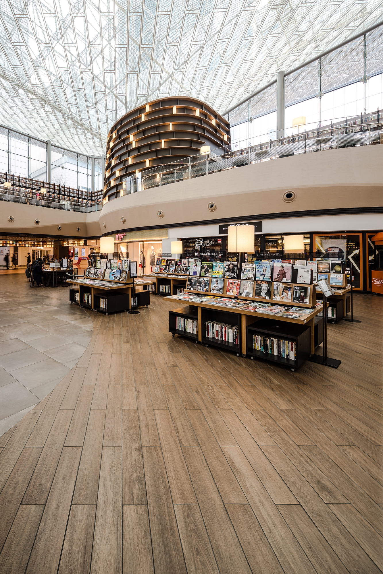 Per pavimentare questo tempio della cultura il celebre studio Gensler ha scelto Prestige di Marca Corona, la serie effetto legno ispirata alle essenze più pregiate del rovere