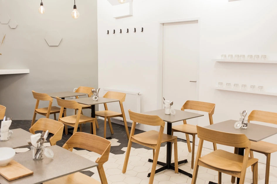 The second visually dominant material is oak wood. It is used as the bar-counter´s top panel as well as the TON Merano brand chairs and barstools, designed by Alexander Gufler, a young Italian designer living in Vienna. These products, with their unusual shapes, based on a combination of solid wood with harmoniously shaped bent-plywood seats and backrests, reinforce the unique look of the whole interior. The feeling of warmth that the wood offers is then also reflected in the tones of the lighting system. This is reinforced by a series of industrial vintage lamps scattered across the ceiling.