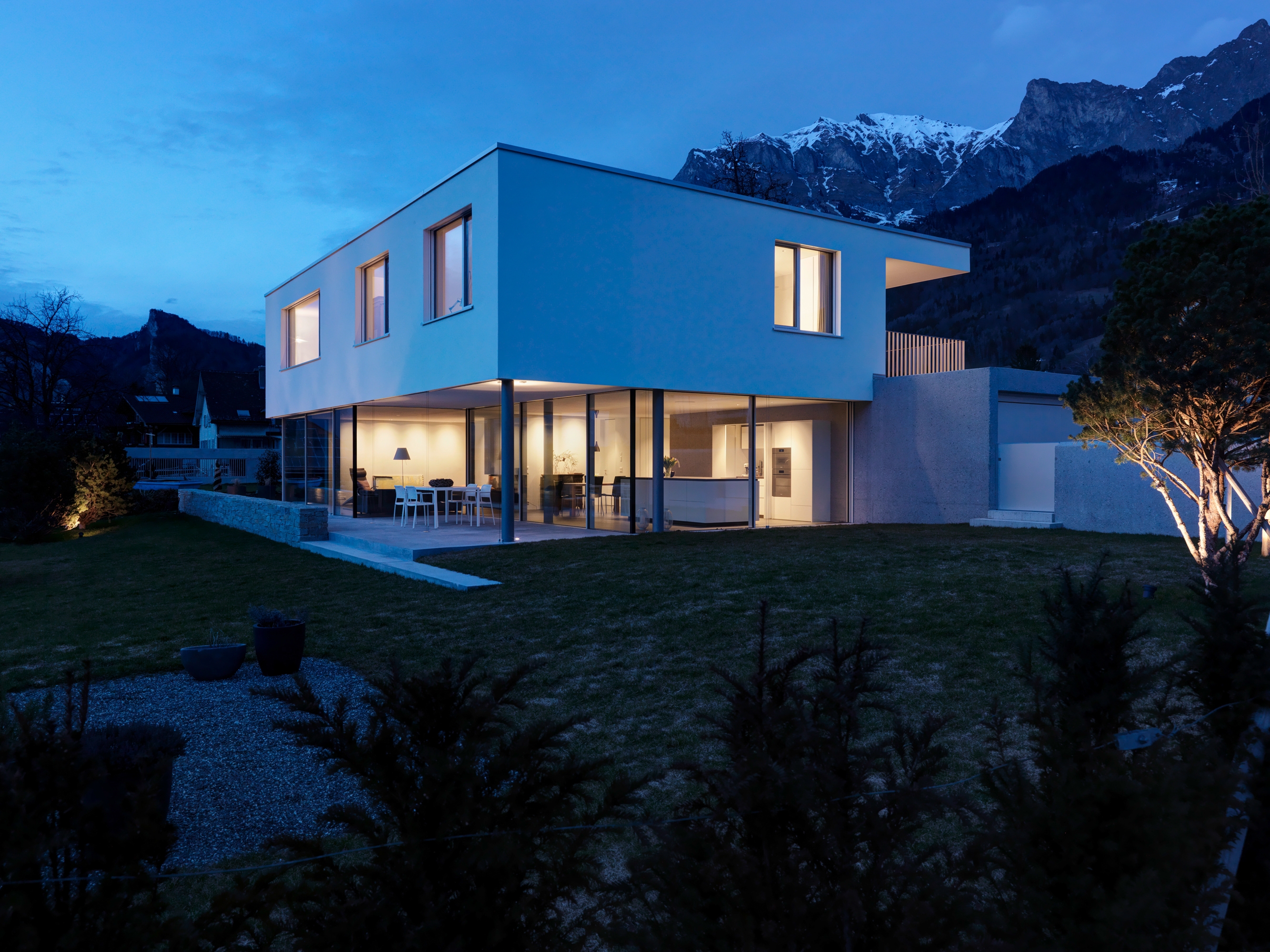 The living room floor with its fireplace is oriented towards the spacious garden, and is visually limited by the low naturally formed stone wall outside. The separation between inside and outside, between warm and cold, is achieved by a technically sophisticated, filigree glazing with electrically controllable sliding panels, creating a sense of inside space for living that is nonetheless outside in the garden. The bedroom floor above gives the open floor plan on the first floor stability, and clears the way to the beautiful view of the Pfäfers Benedictine monastery from the 8th century.