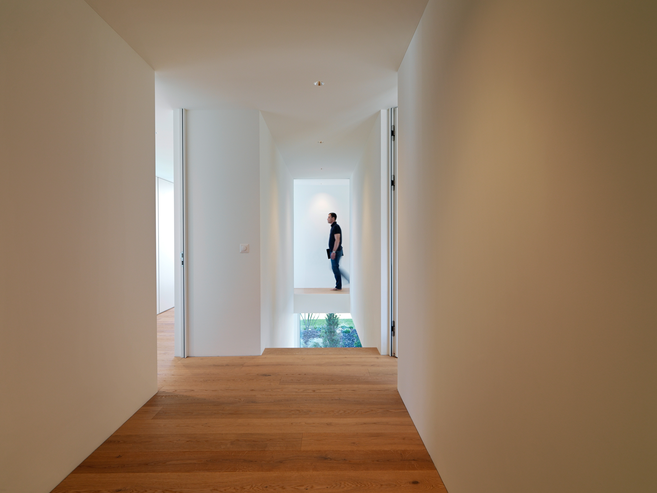 The plot, which is located on an arterial road out of the city, was approved for development so that four new residential buildings could be constructed. The project plays with these two characteristic elements – at times it is the vineyard wall alone, which in combination with the garage forms an enclosed entrance; at other times it is the pear tree, the canopy of which seems to protrude into the parents' bathroom. In front of the piano room the two elements meet and together with the house form a sheltered place to linger, which in high summer is visited by the mild rays of the evening sun.