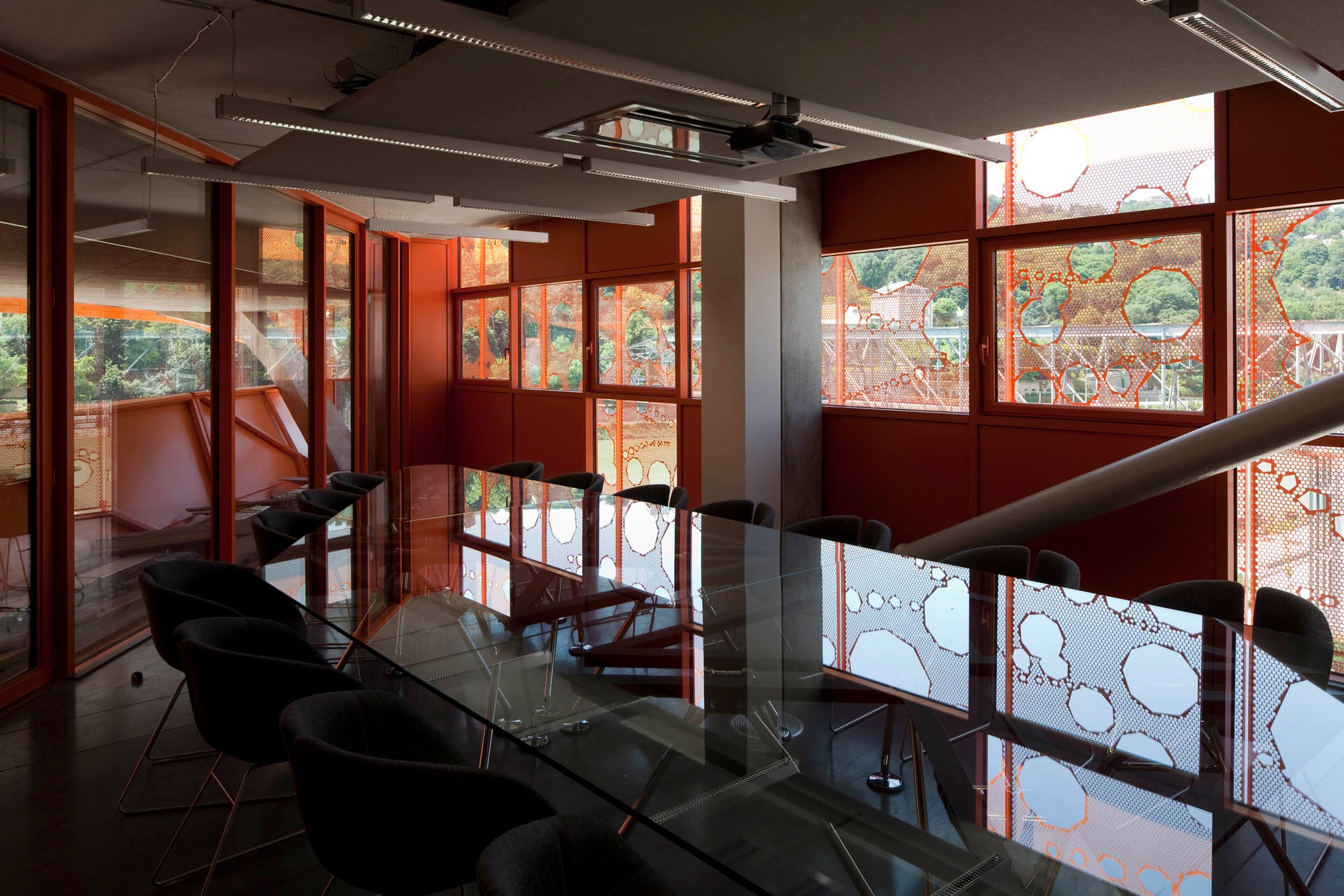 The tertiary platforms benefit from light and views at different levels with balconies that are accessible from each level. Each platform enjoys a new sort of conviviality through the access on the balconies and its views, creating spaces for encounter and informal exchanges. The research for transparency and optimal light transmission on the platforms contributes to make the working spaces more elegant and light.