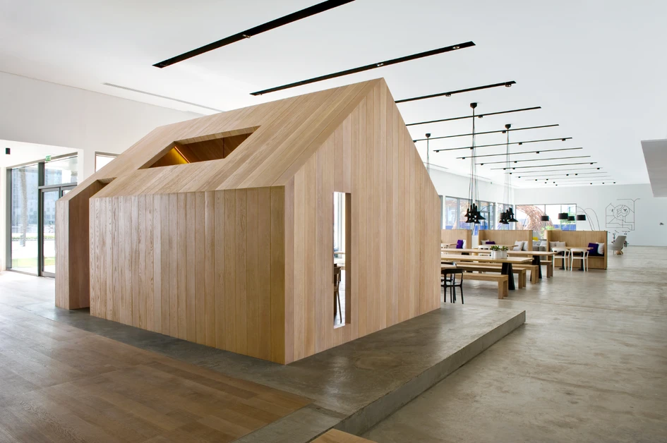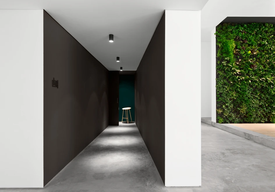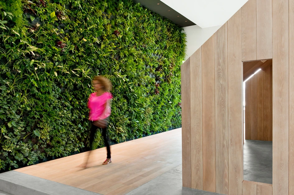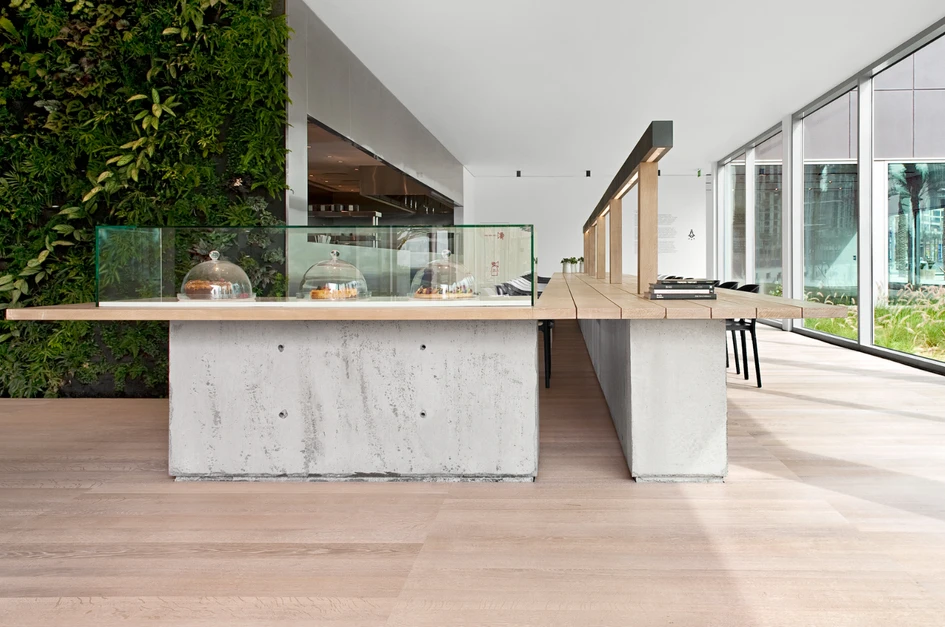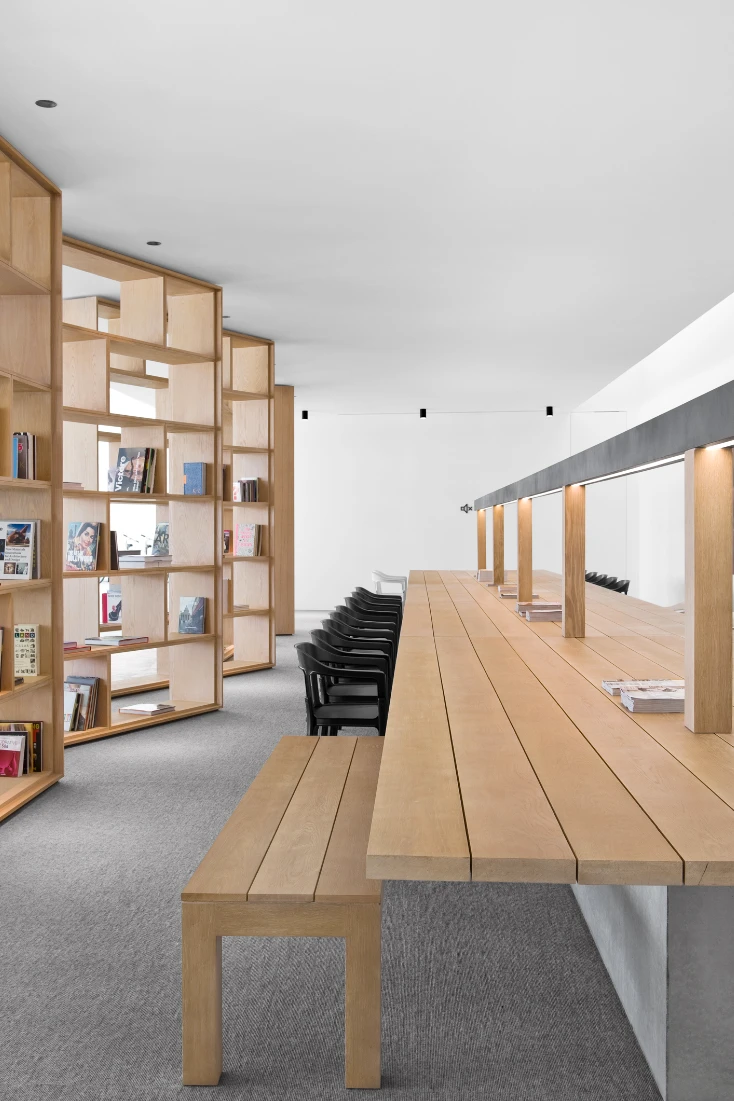 The Pavilion is anchored by two gallery spaces and offers a library, lounge, restaurant, espresso bar and screening room. The spacious open-plan area is bathed in natural light and an unexpected natural oak semi-enclosed “shed” structure sits at the far end of the space. Behind it, a towering vertical garden adds another dimension to the minimal setting, introducing life, color, texture and originality. Massive communal tables reinforce the idea of dialogue and community. A calming, understated and neutral palette of materials is dominated by concrete and brushed America white oak and punctuated by blackened steel. Crisp white floating walls, high ceilings, and minimal details throughout define the pure open spaces.