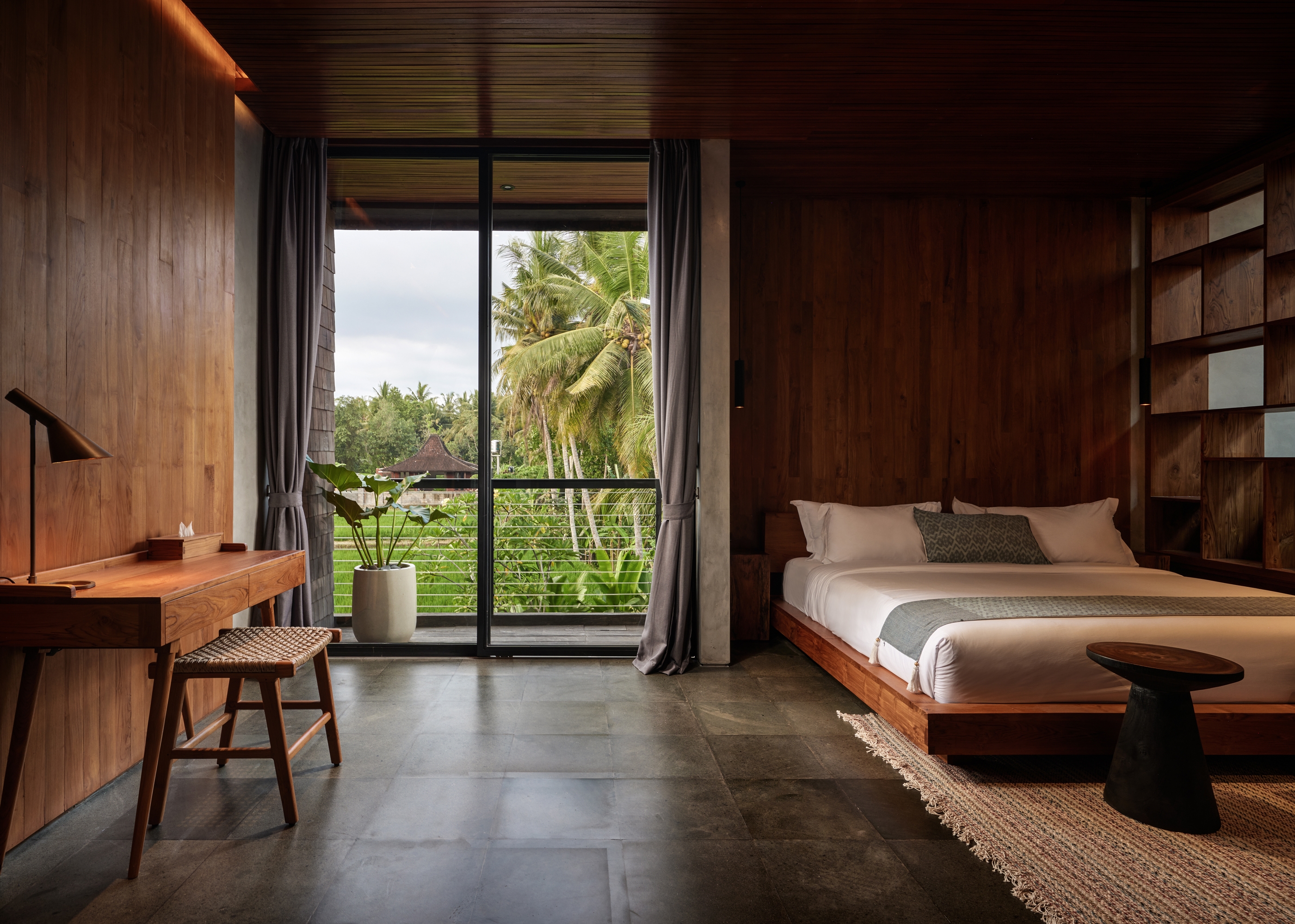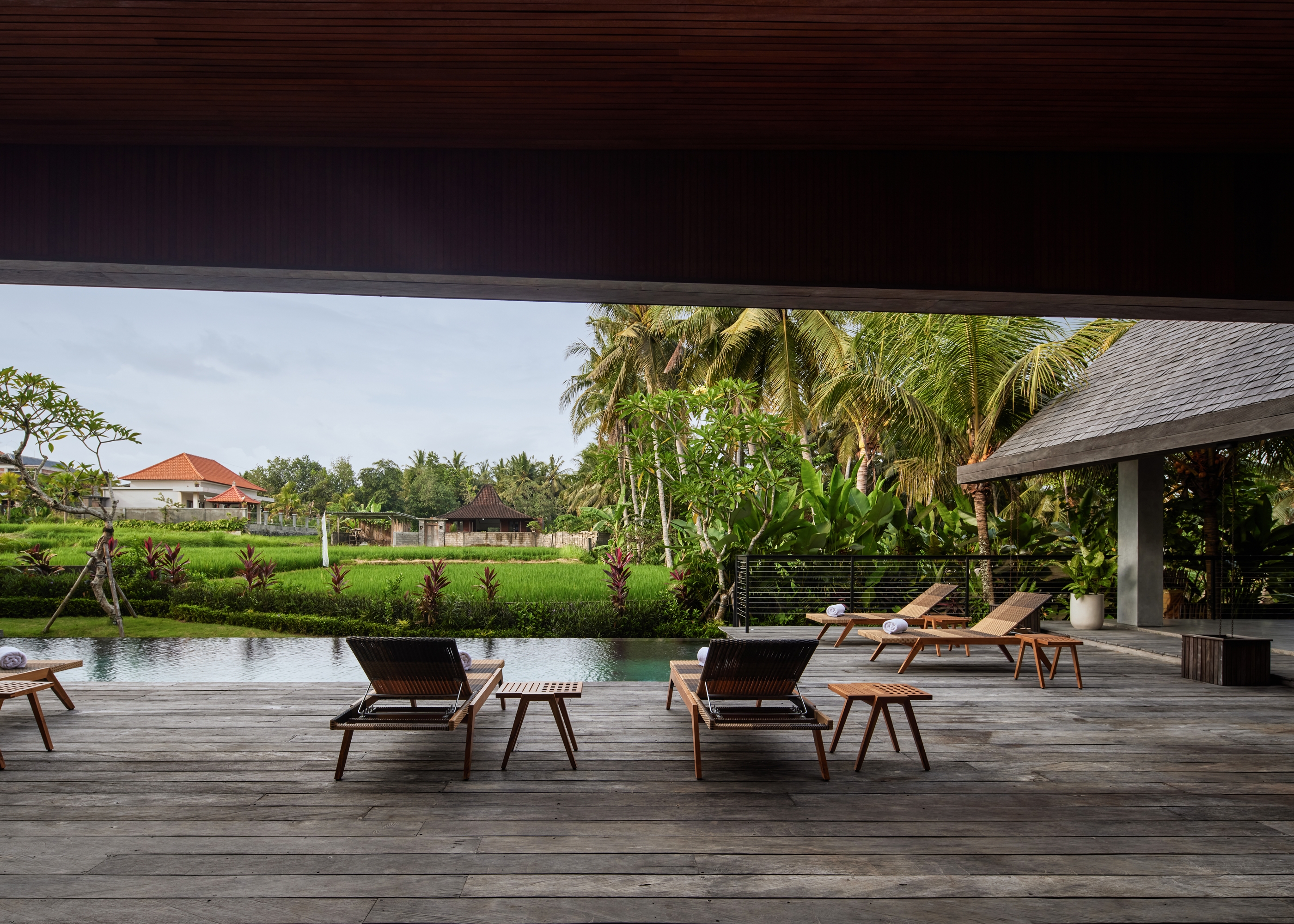 The L-shaped floor plan brackets the pool and deck space area and formulates half of the courtyard, yet open to the neighbouring rice fields.