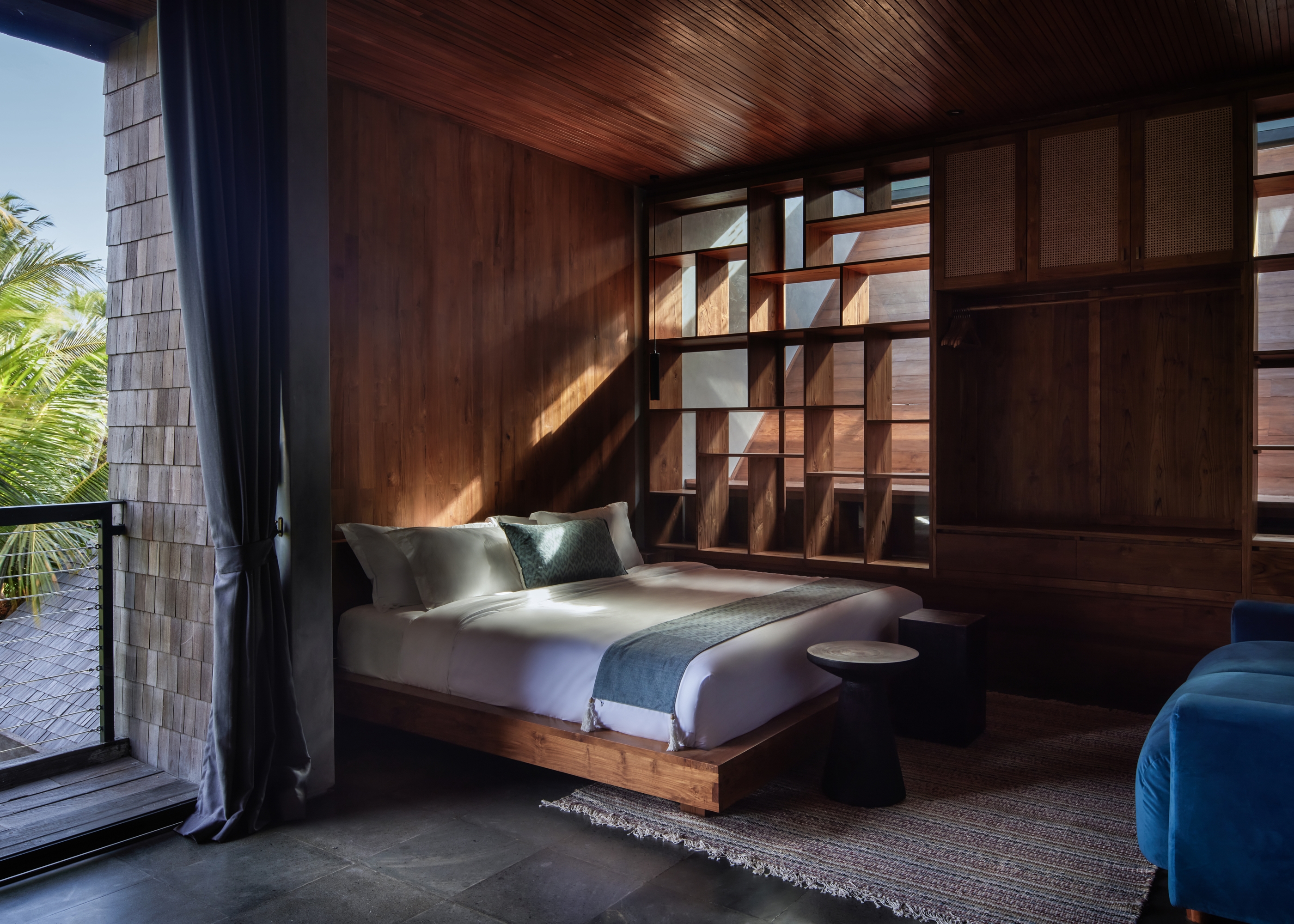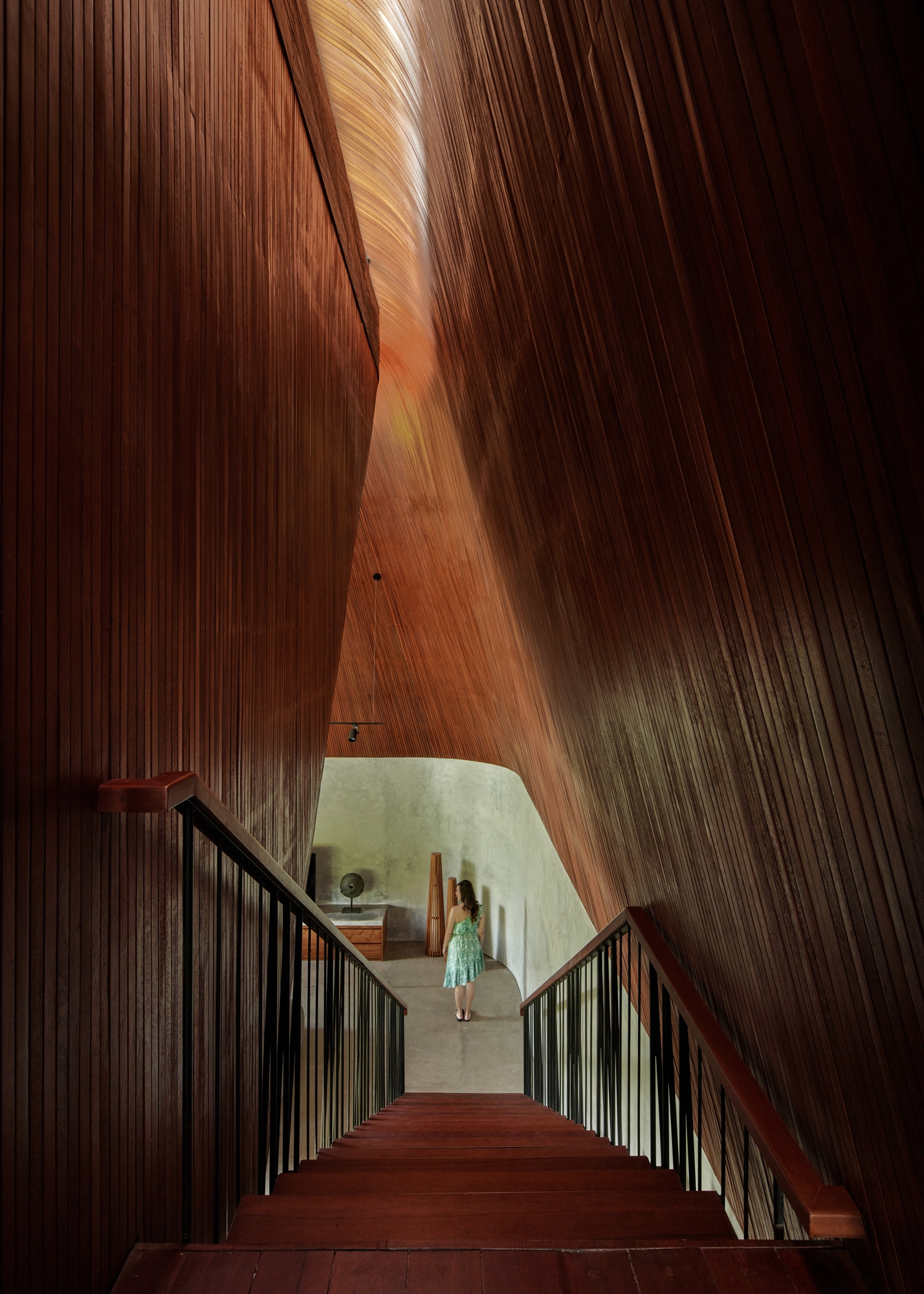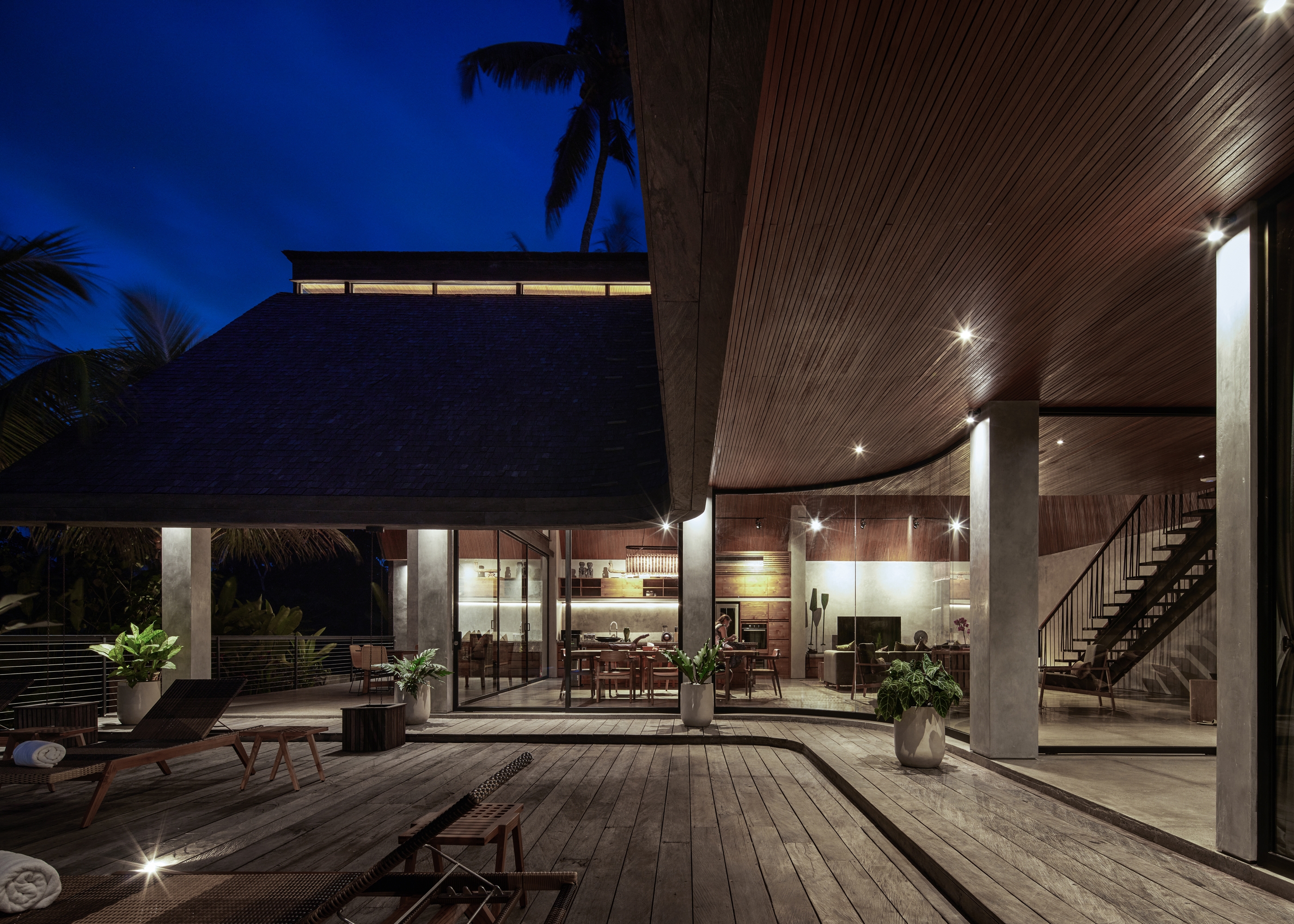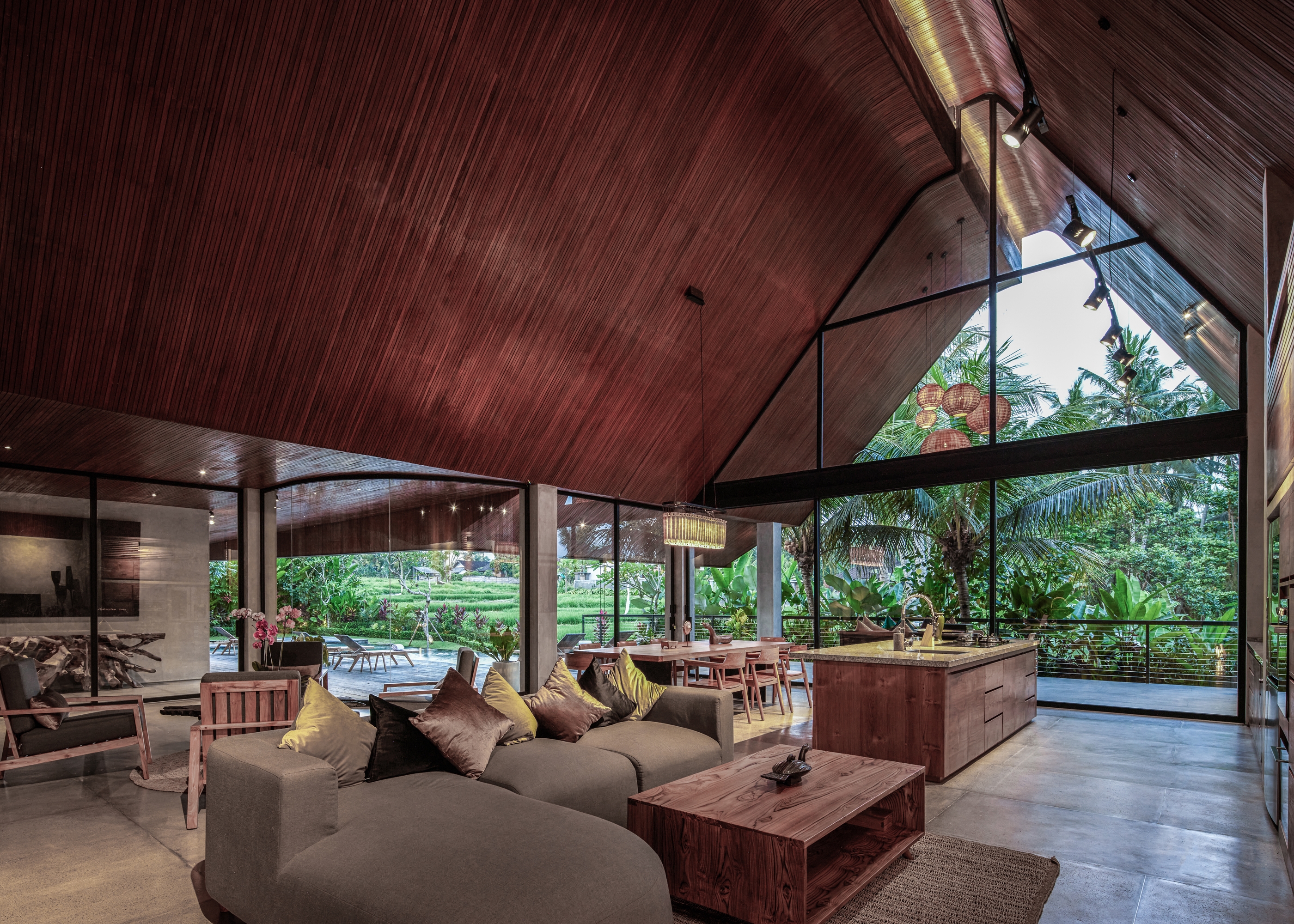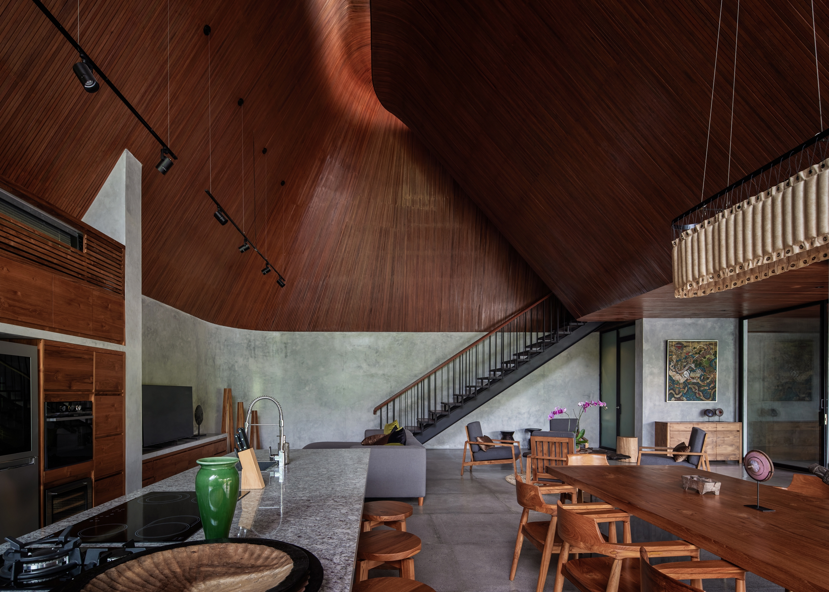 The light crease dramatically pulls the attention inward to the hallway, or from the hallway out to the living room. The fluted ceilings articulate the distinct material concept, the wood adds to the warm atmosphere of a tropical home. Large transparent glass façades make the inside connect to the outside. Large overhangs protect from the heavy rains and sunshine of Bali.