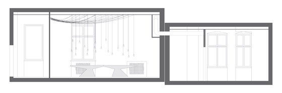 Kernstück des Gastraumes ist die Bar. Für das Tresenblatt wurde Zinkblech verwendet, das handwerklich mit tausenden von Hammerschlägen getrieben wurde und so eine funkelnde Oberfläche erzeugt, im Gegensatz zu den stumpfen, dunklen Wand- und Bodenflächen. Ein weiteres Augenmerk bildet die expressive, 4,20 m lange Tafel für 20 Personen im hinteren Teil des Raumes.
