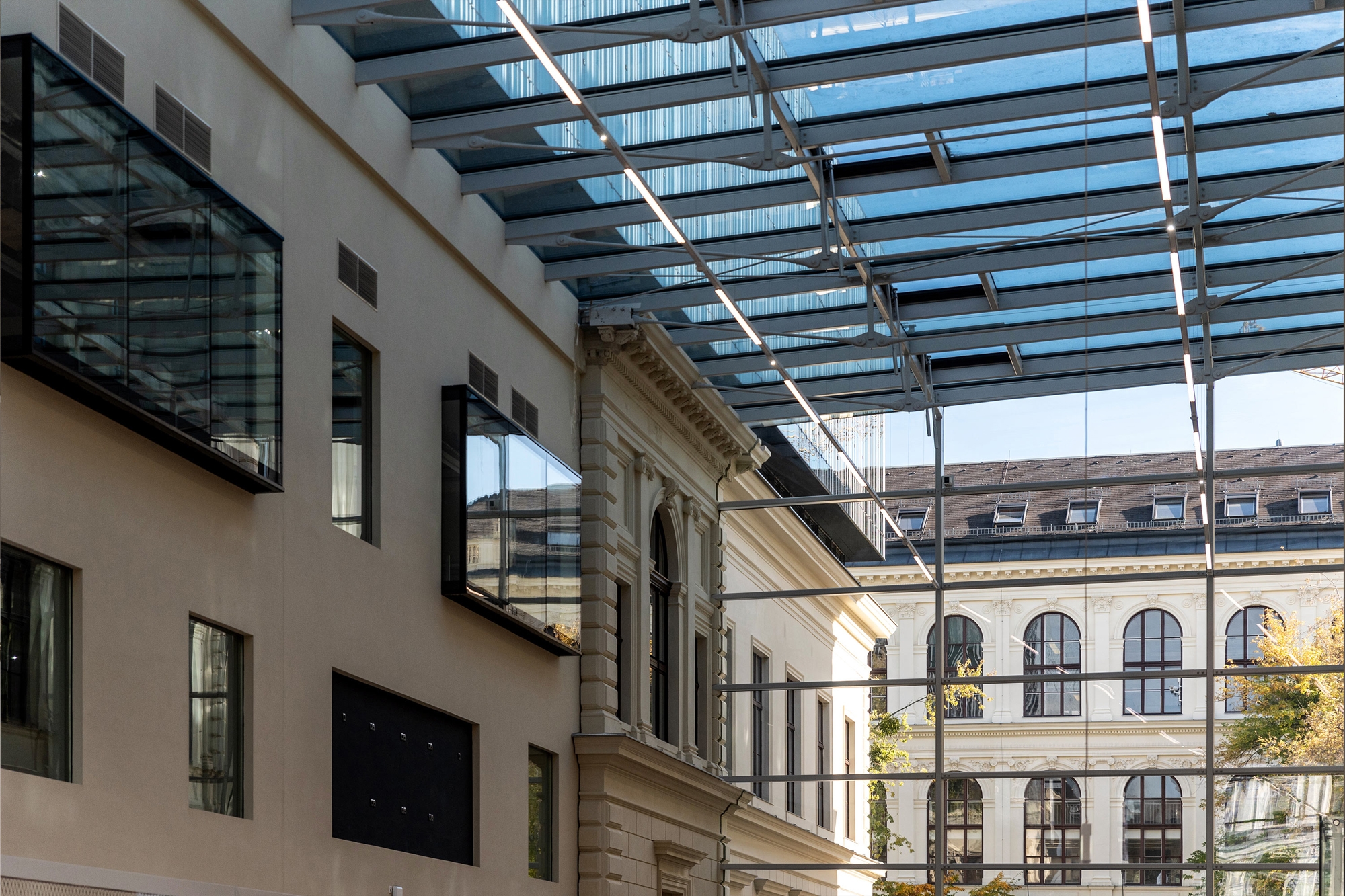 An impressive meeting and study place has been created on the campus of the Karl Franzens University in Graz: the new university library harmoniously combines the old and the new. The spectacular attraction is the cantilevered new building, which seems to float above the historic reading room.