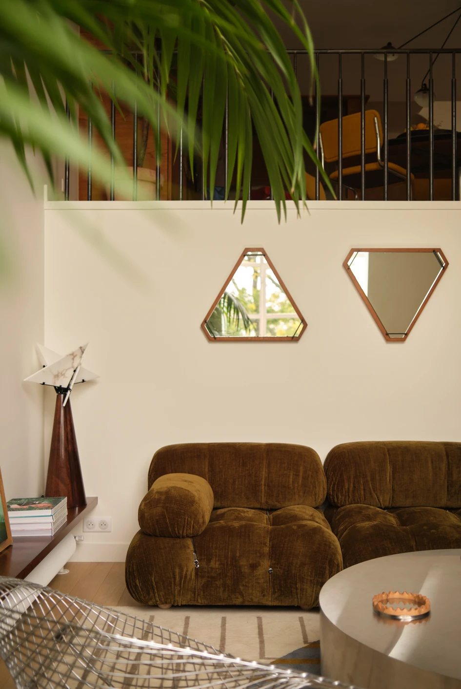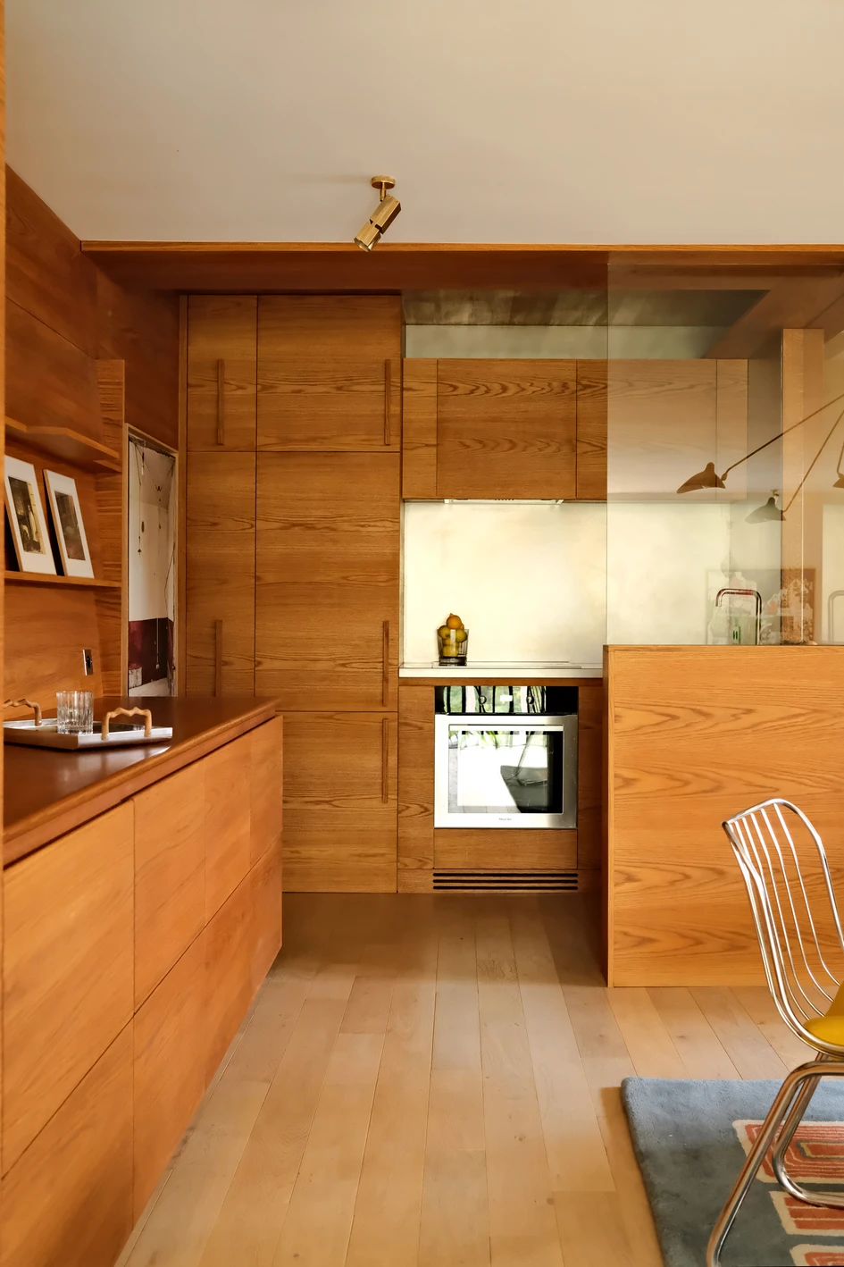 The kitchen is located on the mezzanine overlooking the living room. It was entirely custom-made with stained oak. The worktop and the credenza are in polished stainless steel.