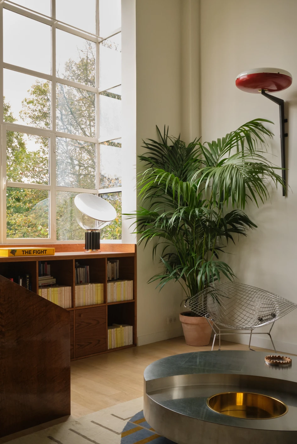 The stairwell is lined with Pierre Frey natural fiber wallpaper Wever & Ducre wall lamps.