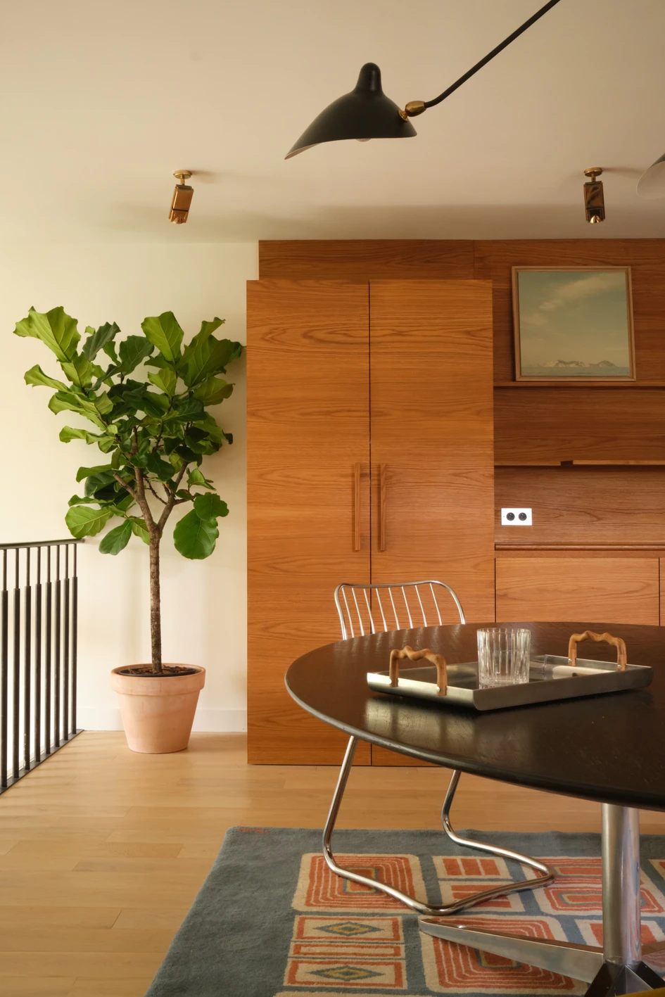 The dining room is on the mezzanine. It was entirely custom-made with stained oak.