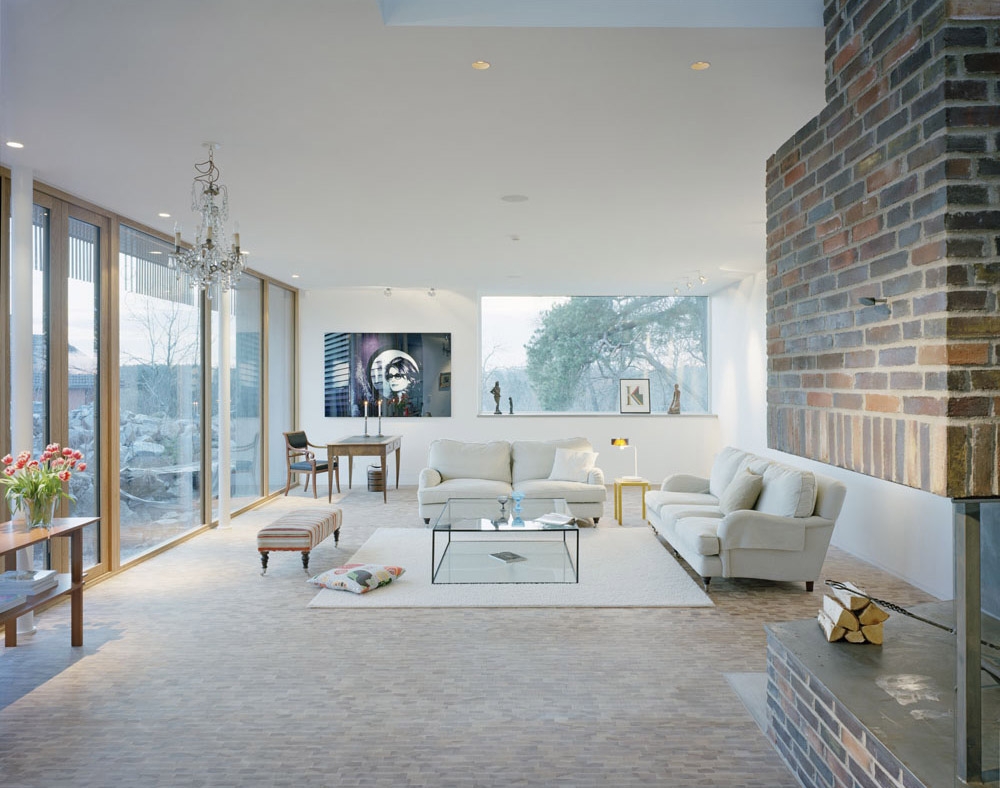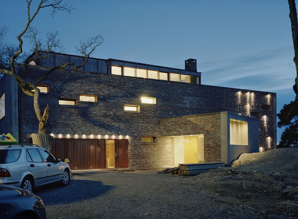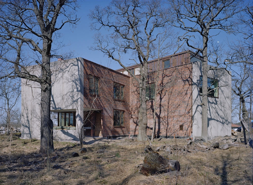 The cross plan organizes the program and creates outdoor spaces that vary in character. A welcoming entrance place, a sheltered place for the morning coffee, a garden with sun all day and a back yard towards the north for storage of garden tools and fire wood. The facade changes as you move around this big villa and only durable materials are used such as brick, concrete and copper that will grow old with patina.