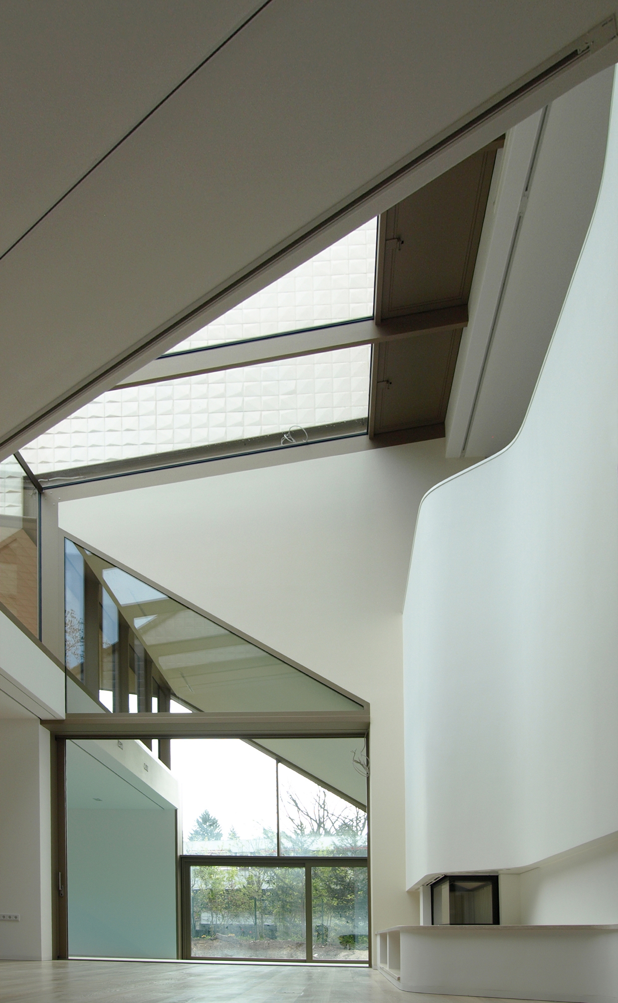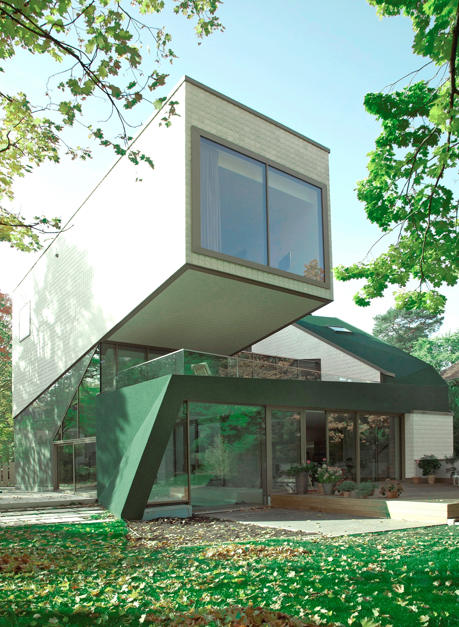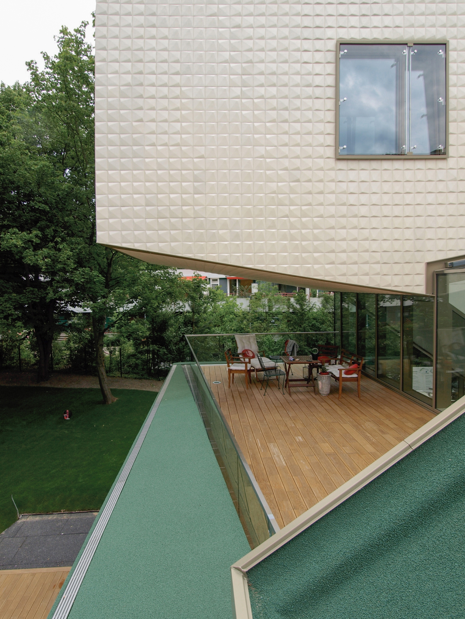 The street elevation is dominated by a façade covered entirely in specially made stoneware tiles. The small, (20 X 20 cm) three dimensional and cream white coloured tiles give the impression of a scarp in the mountains. Each one of the asymmetrical tiles is fixed differently and, thus, reflects the incoming light in a myriad of ways. This dynamic cube rests on the ascending ribbon of a screen printed glass façade which gains in transparency as it reaches the garden elevation. However, the most unusual feature is the sloping dark green tartan roof. It is the first application of its kind in Germany. Vertical and horizontal surfaces are completely covered in EPDM granulate. The contrast between the tiled walls, green slopes and irregular glass surfaces helps to create the impression of an architectural mountainscape.
