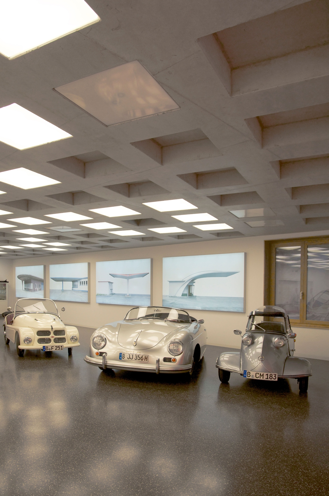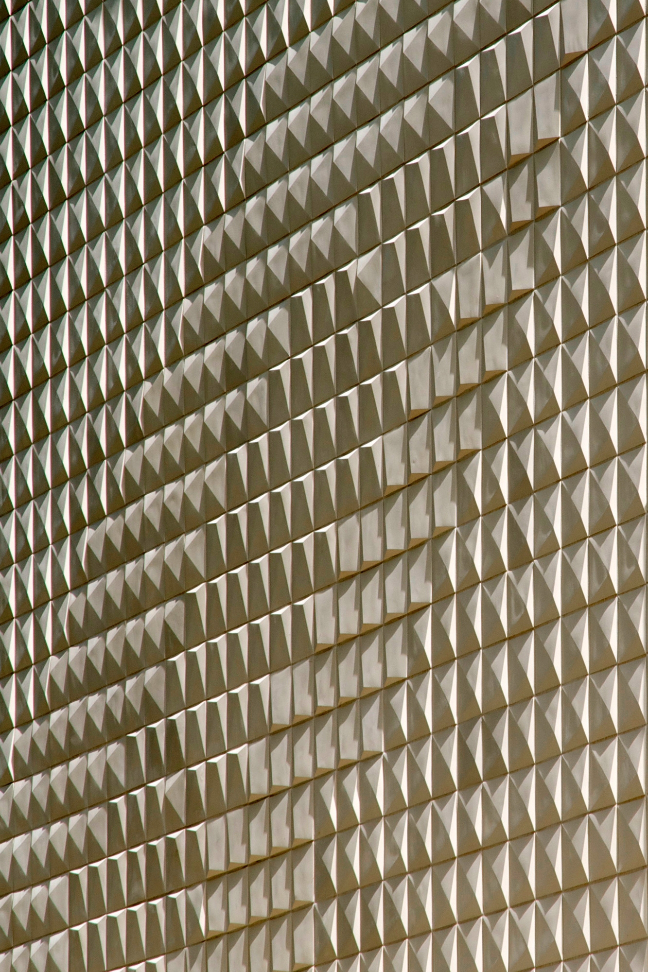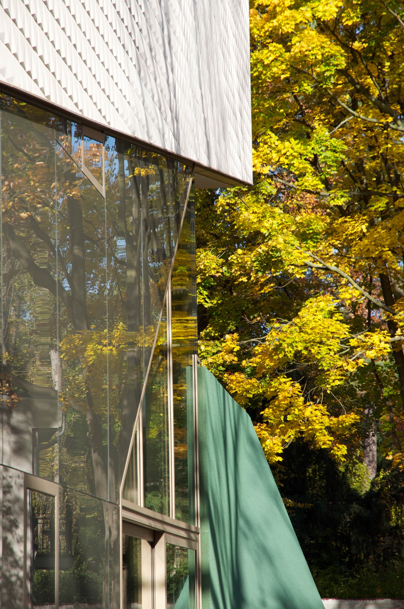 The street elevation is dominated by a façade covered entirely in specially made stoneware tiles. The small, (20 X 20 cm) three dimensional and cream white coloured tiles give the impression of a scarp in the mountains. Each one of the asymmetrical tiles is fixed differently and, thus, reflects the incoming light in a myriad of ways. This dynamic cube rests on the ascending ribbon of a screen printed glass façade which gains in transparency as it reaches the garden elevation. However, the most unusual feature is the sloping dark green tartan roof. It is the first application of its kind in Germany. Vertical and horizontal surfaces are completely covered in EPDM granulate. The contrast between the tiled walls, green slopes and irregular glass surfaces helps to create the impression of an architectural mountainscape.