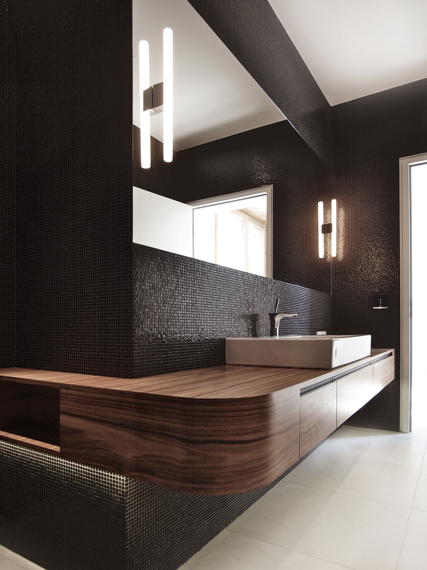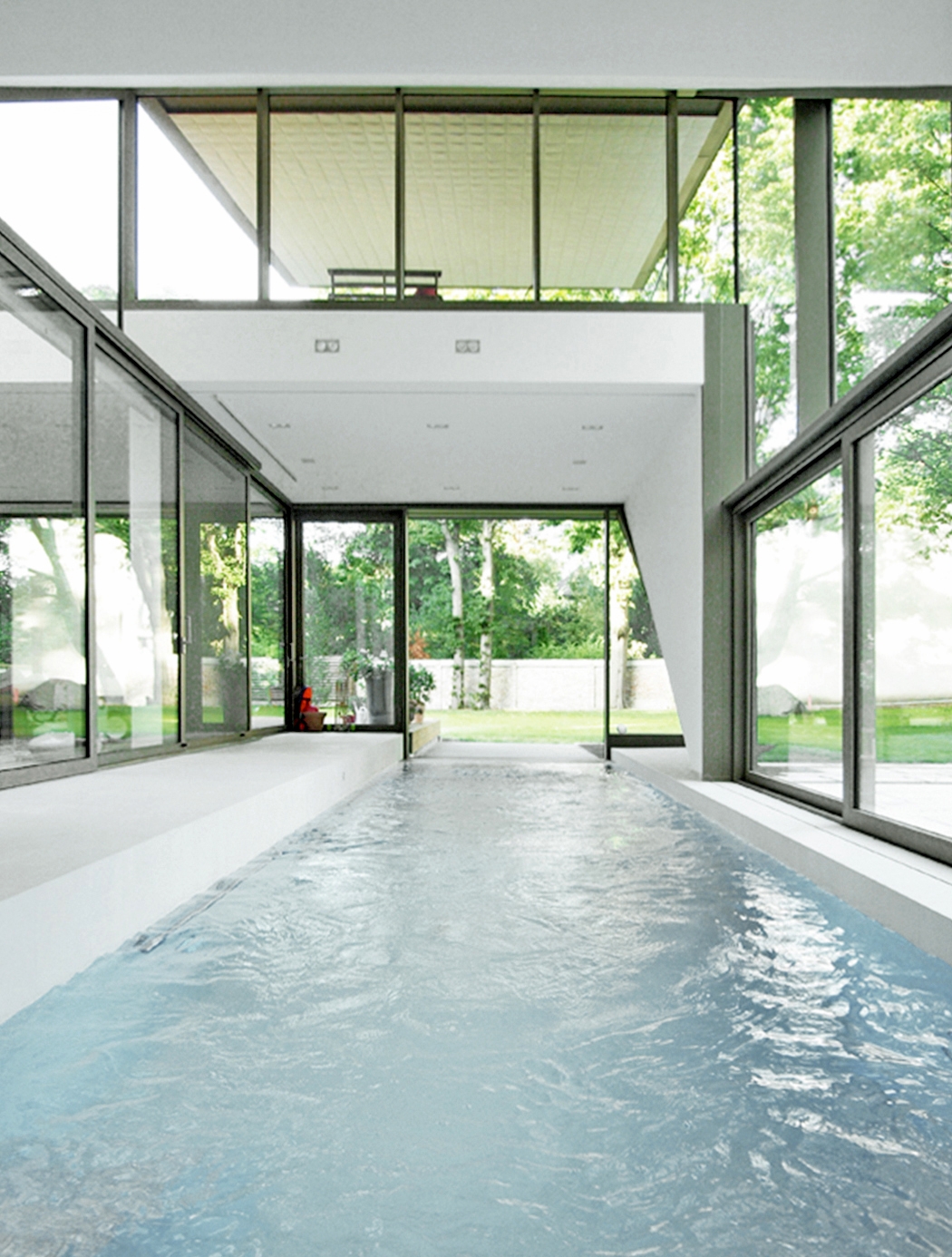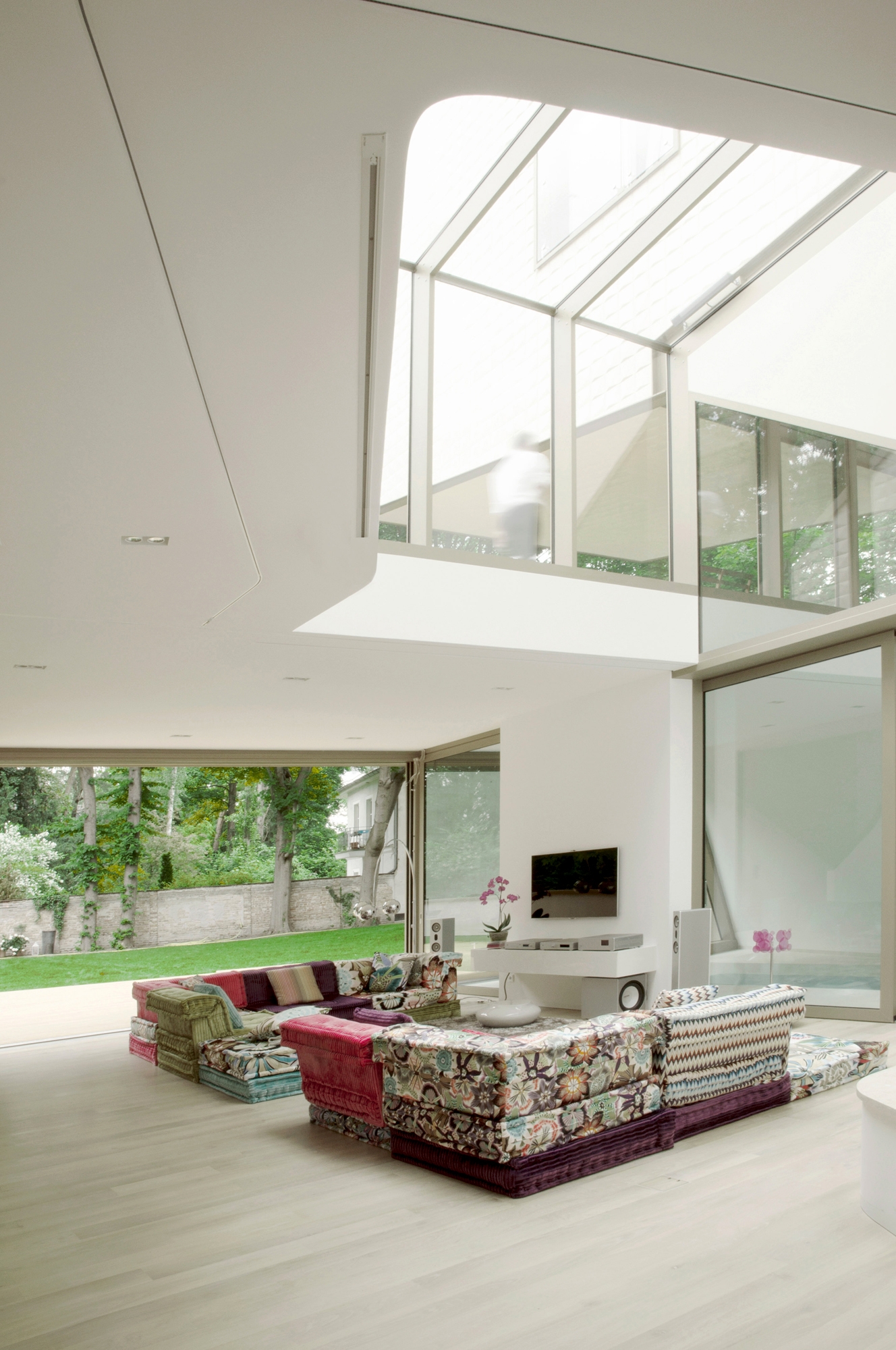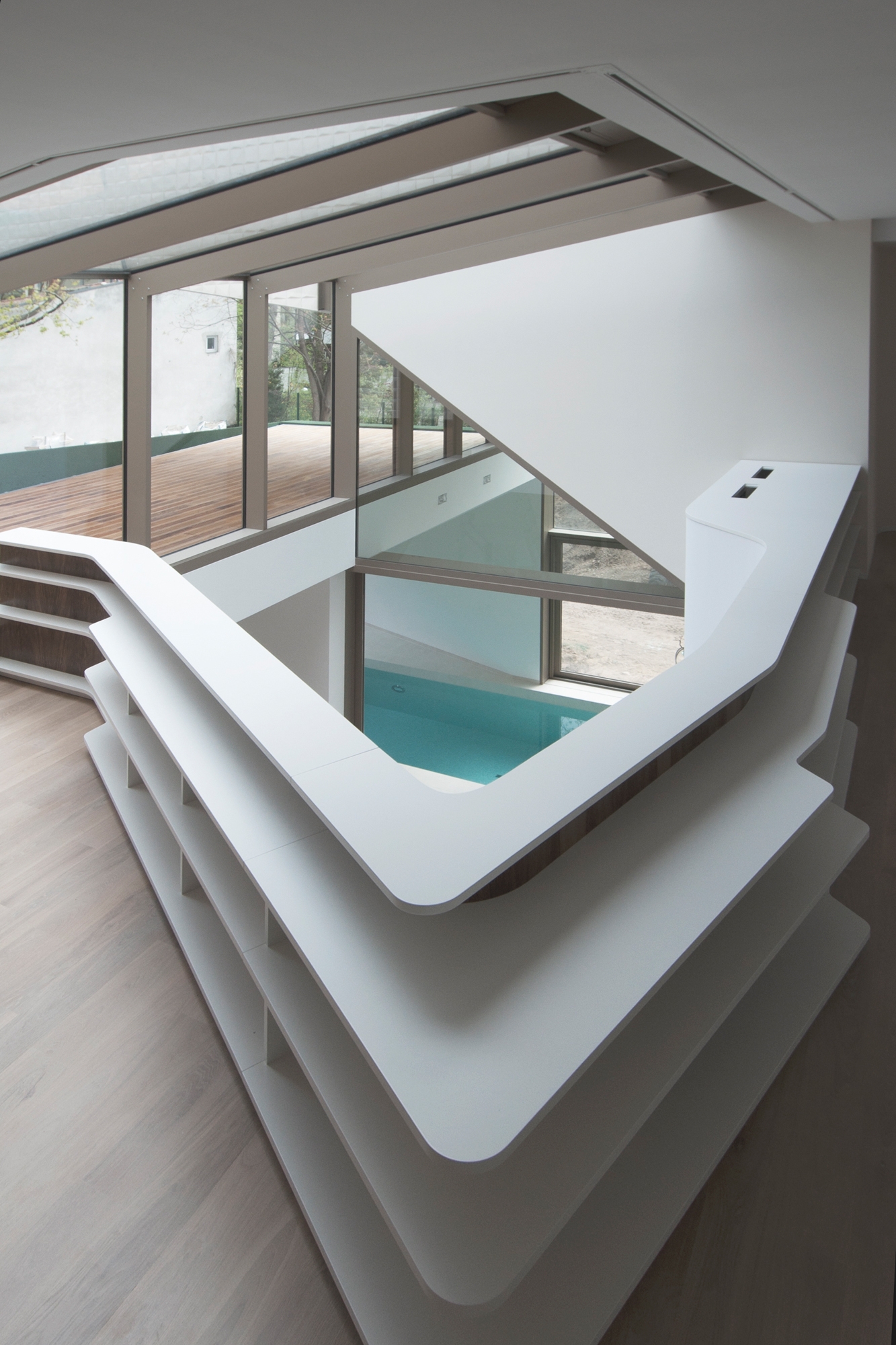 The large south facing plot is located in the middle of the elegant historical suburb Berlin-Grunewald. As the garden should not have been more shaded by the villa than necessary, the building was designed in line with the sun’s path. The steep sloping roof that runs down to the garden is the best evidence for this design approach. The path of daylight into the garden, into the house itself and how it plays on different surfaces and materials was absolutely paramount at all times. In order to bring maximum daylight into the house the architects designed an almost square floor plan with a glass roof covered atrium at its centre. The surrounding spaces and rooms form a habitable topography totally unconventional compared to a standard detached house.