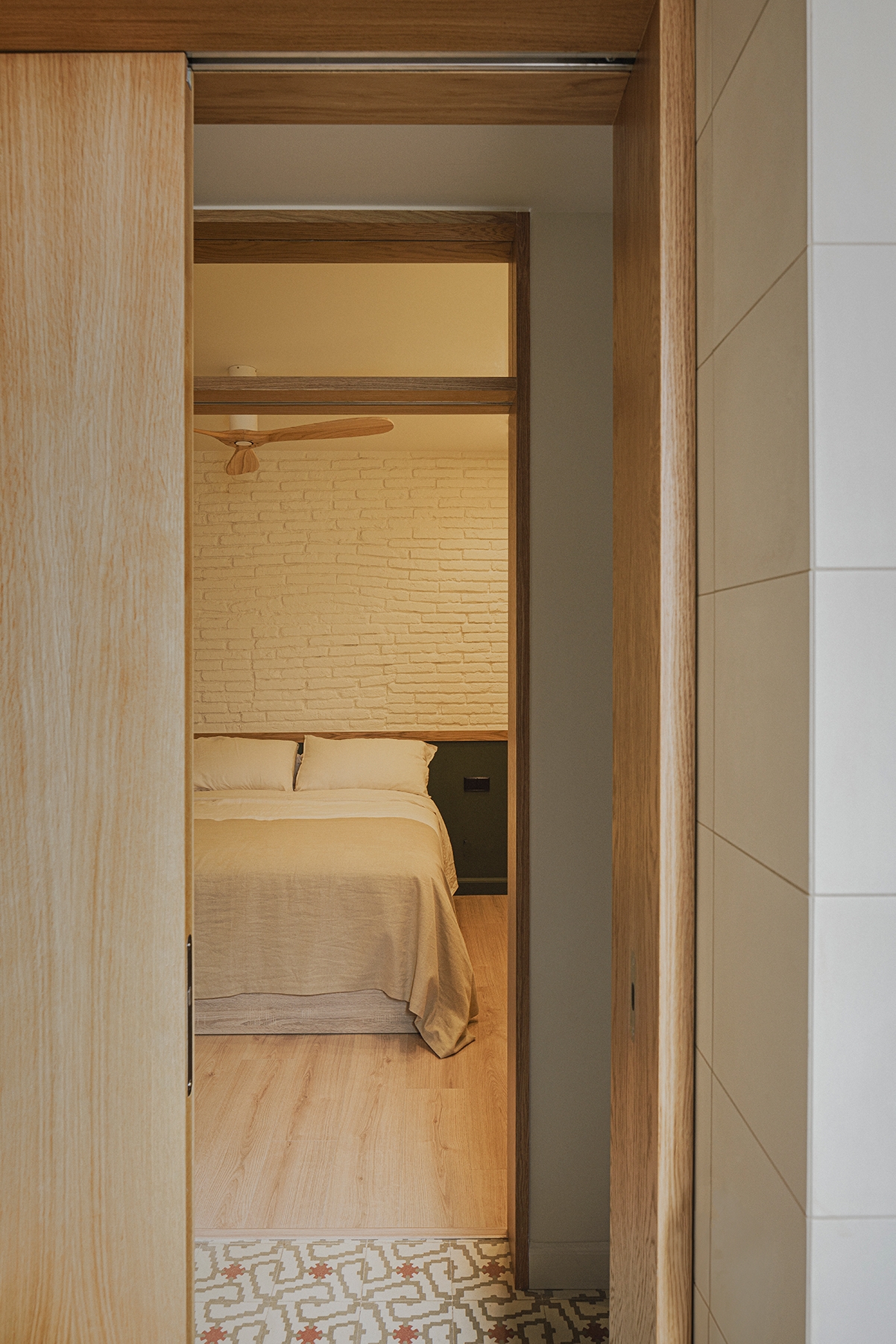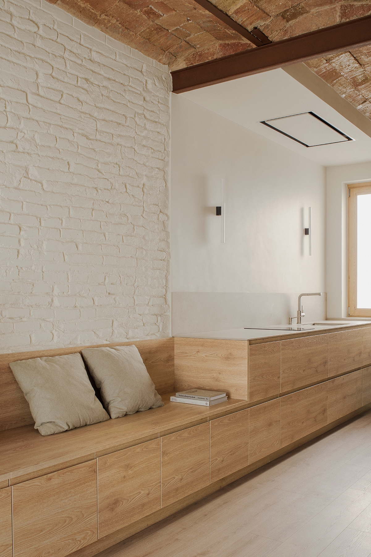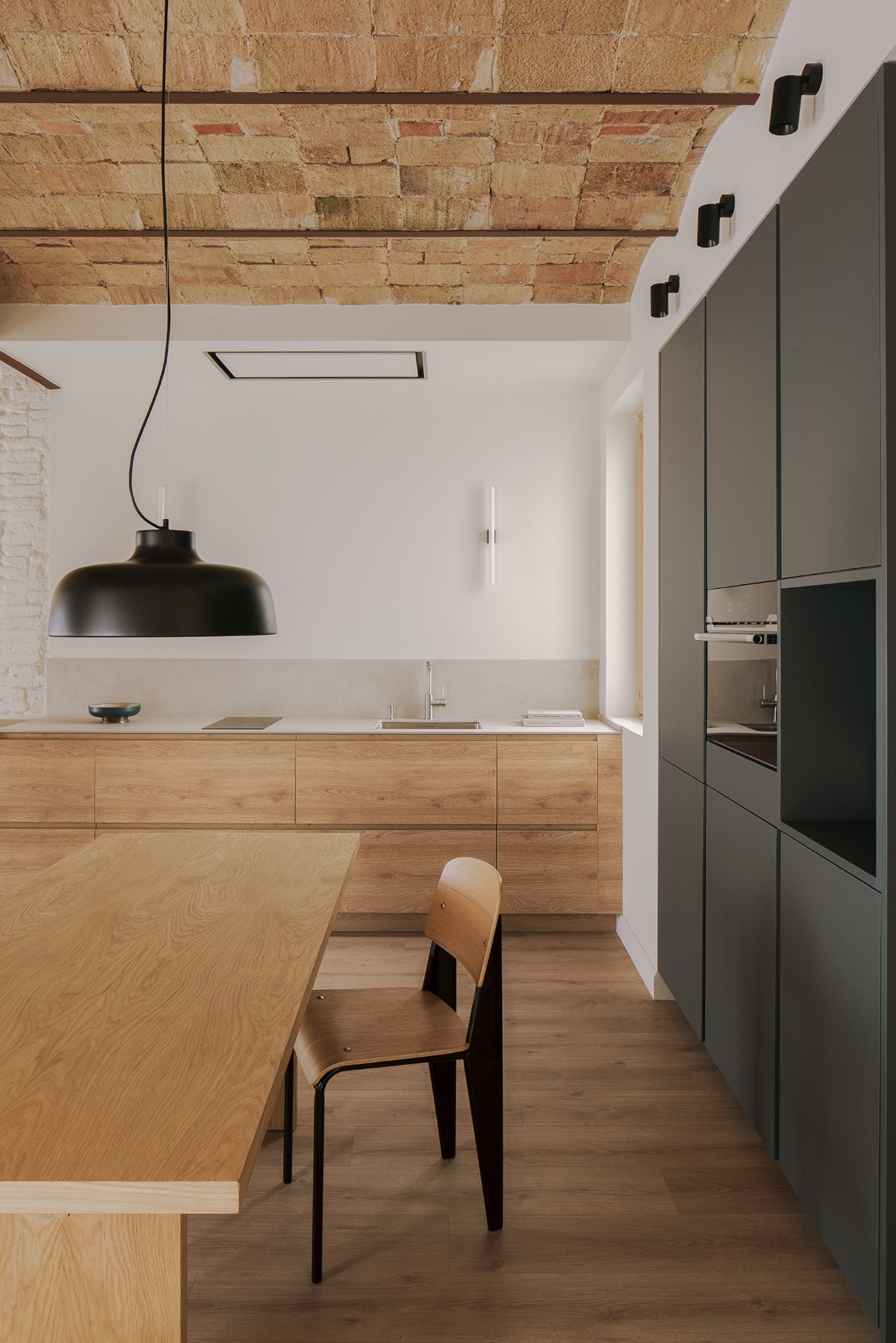 Among the newly introduced materials, wood, featured in the flooring and carpentry, harmonized in tone with the exposed original ceramic ceiling, creating a unified and cohesive ambiance. The restored hydraulic floor tiles added authenticity, and strategically incorporated green elements in the kitchen and storage furniture providing character to the heart of the apartment. Custom-made furniture played a crucial role in maximizing space, with a versatile table serving as a kitchen island, dining table, and workspace, adapting to varying needs. Similarly, a two-tiered longitudinal piece functioned as a bench, storage, countertop, and more.