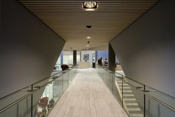 The new structure is accessible through a glass walkway ("promenade architecturale"), from the existing hotel as well as from the entrance level to the hotel. The new building, beyond the “unbuilt space" of the "trees", resolves the relationship with the existing hotel and the ground through a great wall in natural stone. The external public space is therefore redesigned in order to create a cosy atmosphere and to solve the car parks problem thus discreetly integrated in the plan.