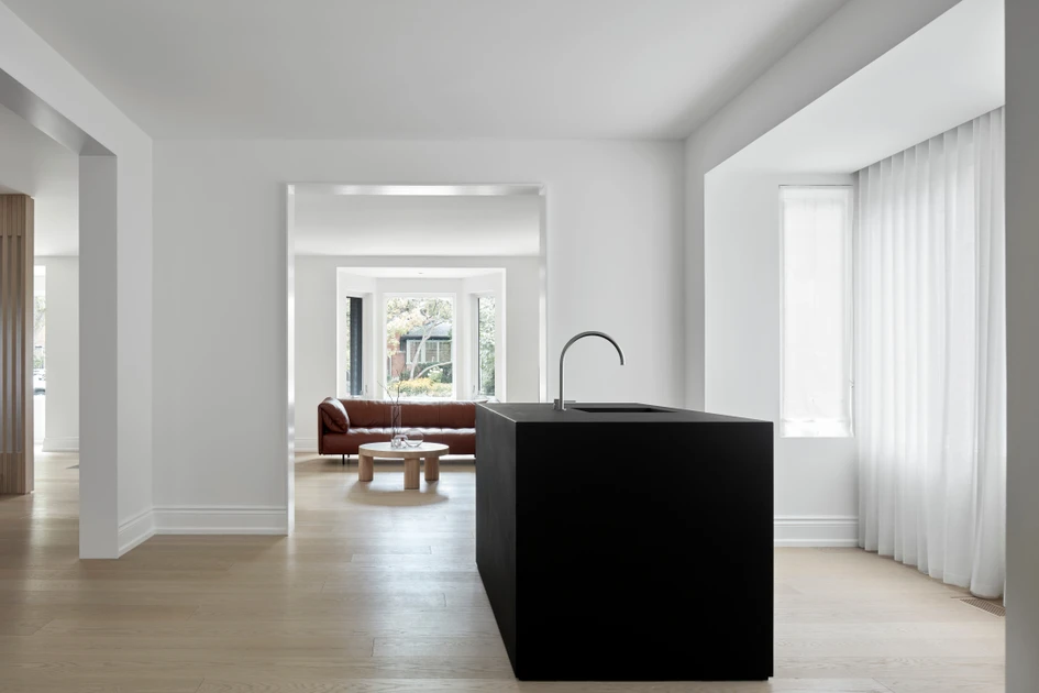 Every design element is conceptualized to produce a unified experience. To accentuate the relationship between the original home and what is new, some of the traditional detailing was retained to contrast Akb's modern interventions. Each room opening is now lined with a thin, blade-like projecting frame that provides a reductive articulation of more classical door casings. The increased size of the openings also marks a more contemporary expression, while providing far-reaching sightlines to the backyard’s abundant greenery.