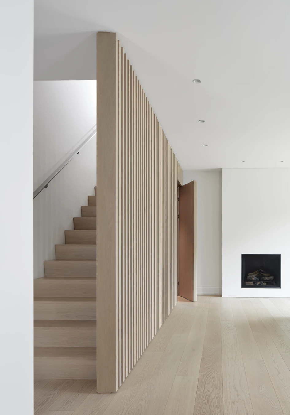 Black design elements punctuate and unify an overall palette of lightness. White-washed natural oak is used on the floors, on the feature stair's wooden screen wall, and with many of the handcrafted furnishings. In the family room, the dominant feature is a linear fireplace set into the wall, framed on either side in a hot-rolled steel. In the dining area, a black version of Claesson Koivisto Rune's playful Extra Large Pendant hangs above a custom white oak table, designed by Akb to be compositionally proportional to the dining area.
