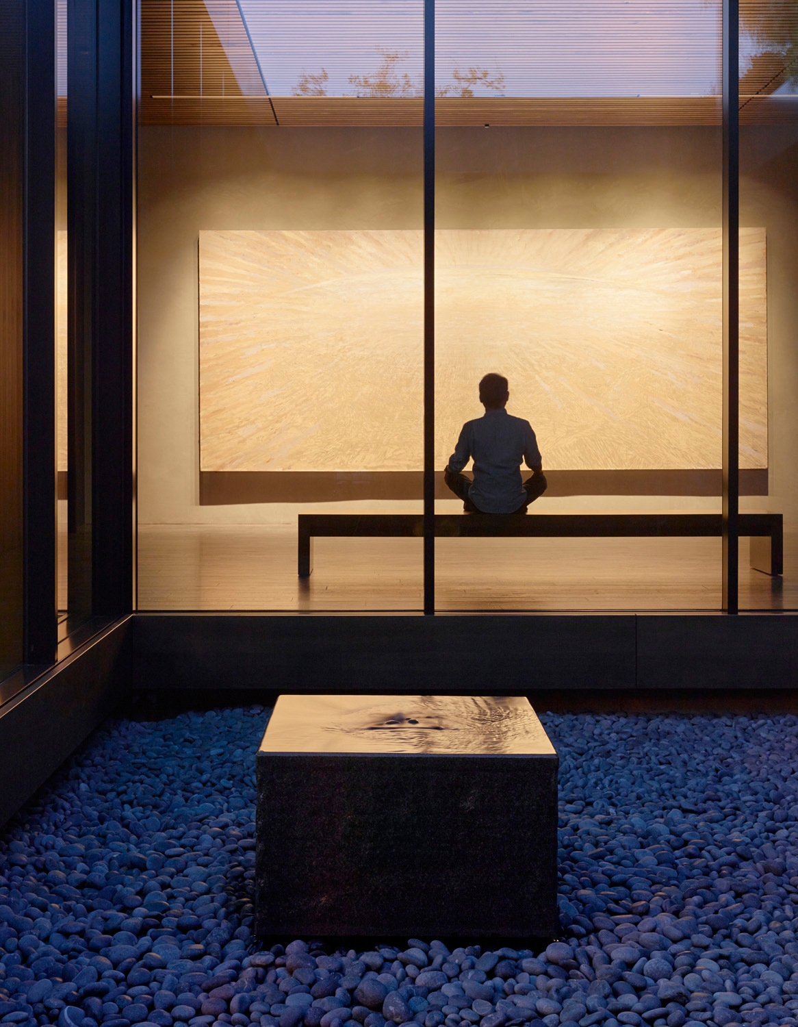 Water, in conjunction with landscape, is used throughout as an aid for contemplation; fountains within the main gallery and the courtyard provide ambient sound while a still reflecting pool to the south reflects the surrounding trees. Exterior contemplation spaces are integrated into the use of the center, allowing views to the natural surroundings as well as to the paintings within. From the oak grove to the east, visitors can view the paintings glowing within the center without accessing the building, effectively creating a sanctuary for the Stanford community day and night.