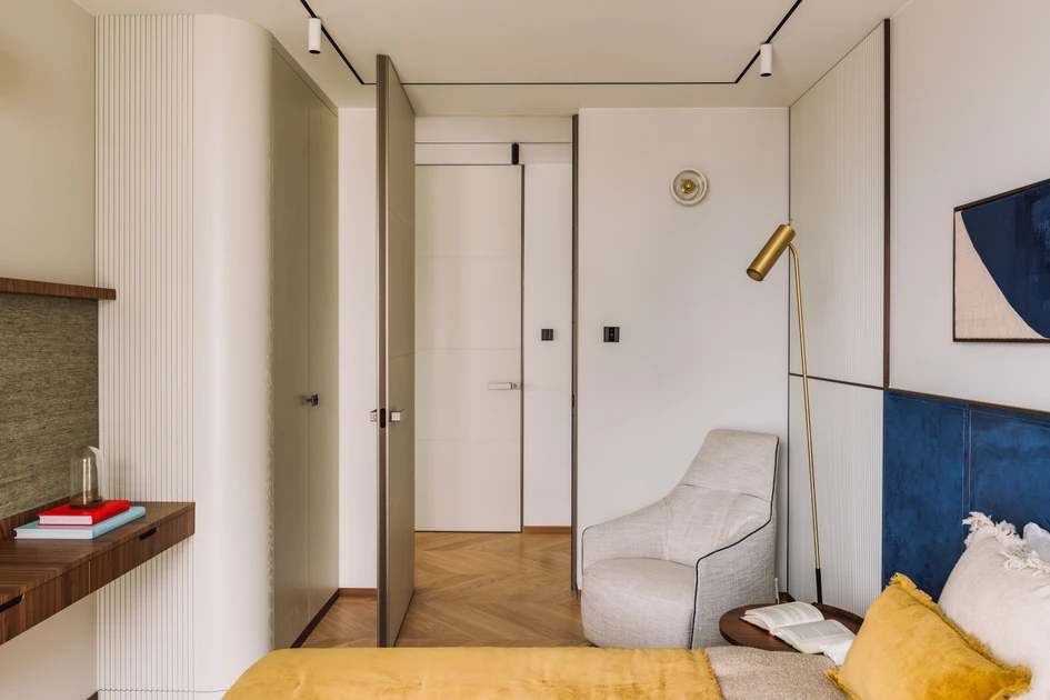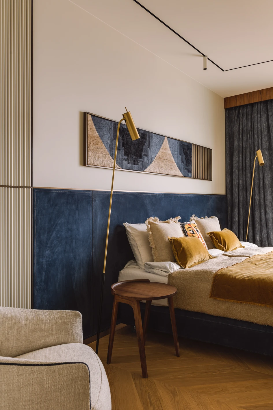 We look into the hidden en-suite ... in the wardrobe all finished in marble with a cream-amber color. The form of a wooden bathroom resembles a yacht's cabin. The whole design is enhanced by atmospheric lighting. In the private bathroom, as requested by the owners, we have a shower. The stone in the shower is grooved with fine stripes. The visible black fittings are from the Fantini brand. On the one hand, we have simple forms and minimalist details, and on the other, luxurious marble, which gives the whole design a unique expression. The hosts treat the apartment as a gateway to the seaside. Along with friends, so naturally there is a room for guests. This time there was room for a bit of color - a beautiful, intense navy blue. Designed bed and backrest, with nubuck leather on them, bedside tables - Porada, Deck model Porada] and comfortable armchair - Poliform model Santa Monica Poliform]. There is a workspace in the guest room: a small desk and furniture have been specially designed. The whole design is enhanced by lamps: floor Vibieffe model Itinerari Stelo (Vibieffe]) and wall lamp Tom Dixon, model Stone (Tom Dixon]).