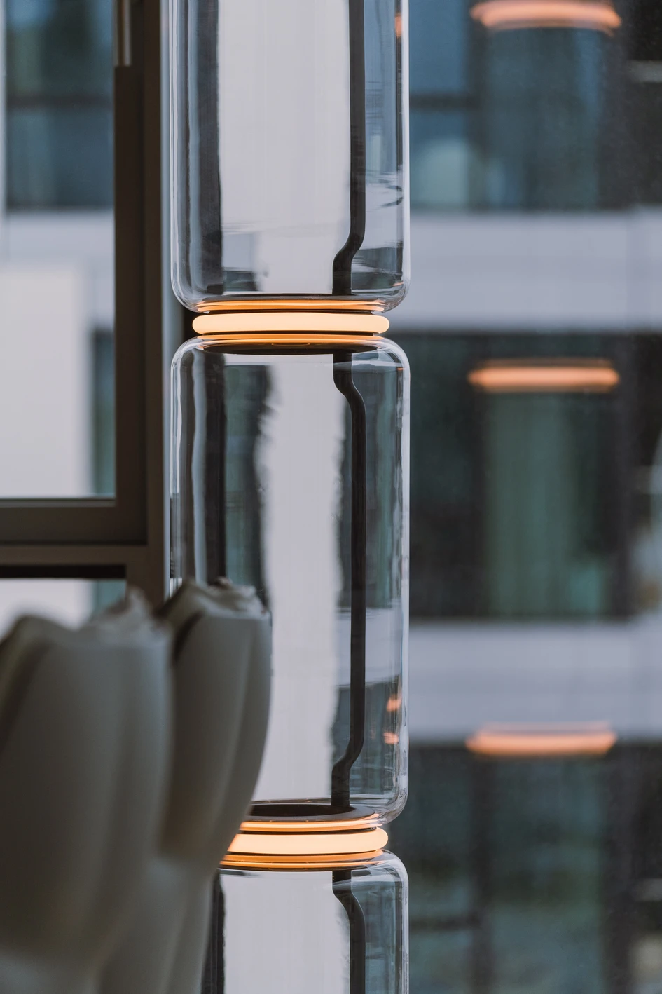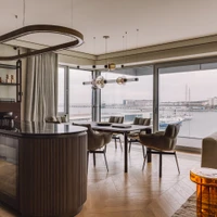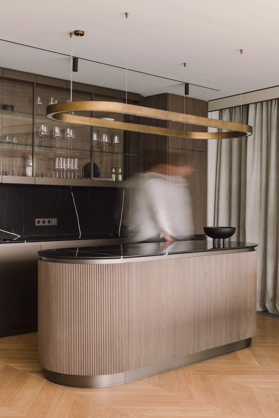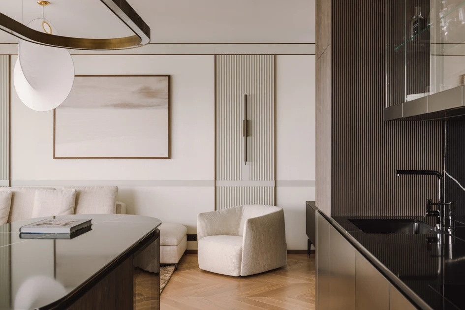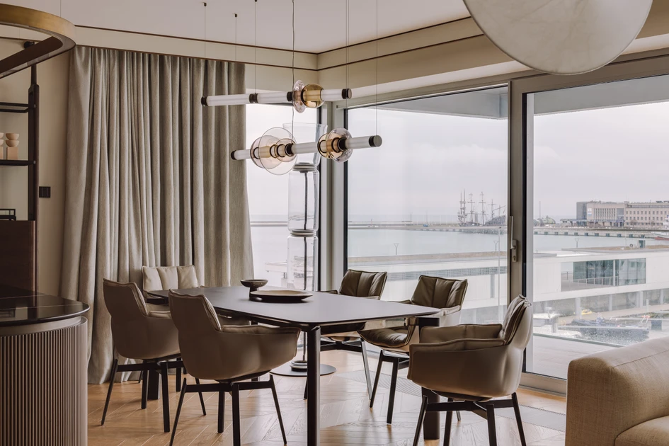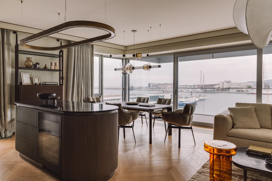 A bright, illuminated living room with a seating area invites you to relax. In the center we have a spacious Poliform sofa (@Poliform) complemented by a Poliform armchair. There was no shortage of designer lighting. This time we focused on a lamp above the sofa Flos, the Overlap model (@Flos) and oblong sconces Rubn (@rubn). Due to the function of an apartment, the kitchen is minimalistic and serves as a buffet. The walls in beautiful black marble are juxtaposed with the brown veneer of the building. The dark kitchenette contrasts with the light floor, gray curtains and the beige seating area. The dining area in all its glory - here we can see the BB Italia table, the Oskar model BB Italia chairs, the Husk model and the Porada bookcase, the Aria model (@Porada). The whole design matches perfectly with each other, creating a coherent composition and fulfilling its task - hosting the hosts and their guests during weekend trips to the seaside. The hosts' bedroom in brown and beige complements the style of the yacht on which they sail. The room consists of constructions in walnut, with glass fronts with embedded fabric (Texglass). Hidden within the building is the entrance to the private bathroom and lockers. Behind the bed, there is a bespoke construction made of wooden rollers against the background of which there is a bed with a beautiful headboard. Opposite the bed there is space for a Vibieffe dressing table, the Swing model (@Vibieffe) and a comfortable Meridiani pouf (@Meridiani). All this against the backdrop of a stunning wall upholstered in dark brown Rugiano (@rugiano) suede leather, which is an intriguing contrast to the light opposing wall and the bed.