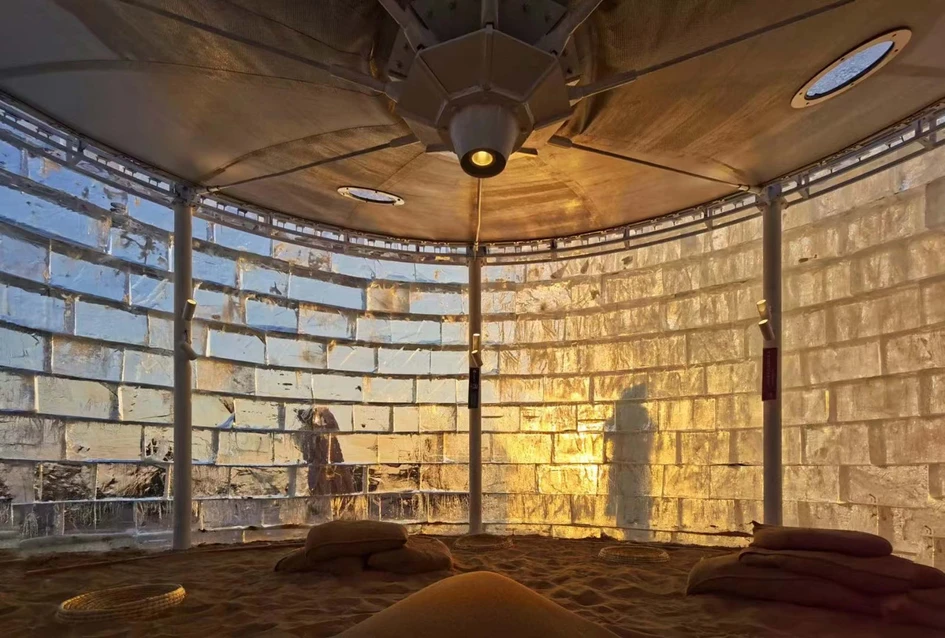 The building's materials are collected from nature, and then decomposed back into nature. The ecological and environmental protection of the building is carefully considered. As time passes, the sand returns to the beach, the ice melts into the ocean, and there leaves only one membrane to document the New Year's Eve memories of Aranya 2023 and the most genuine wishes for the future.